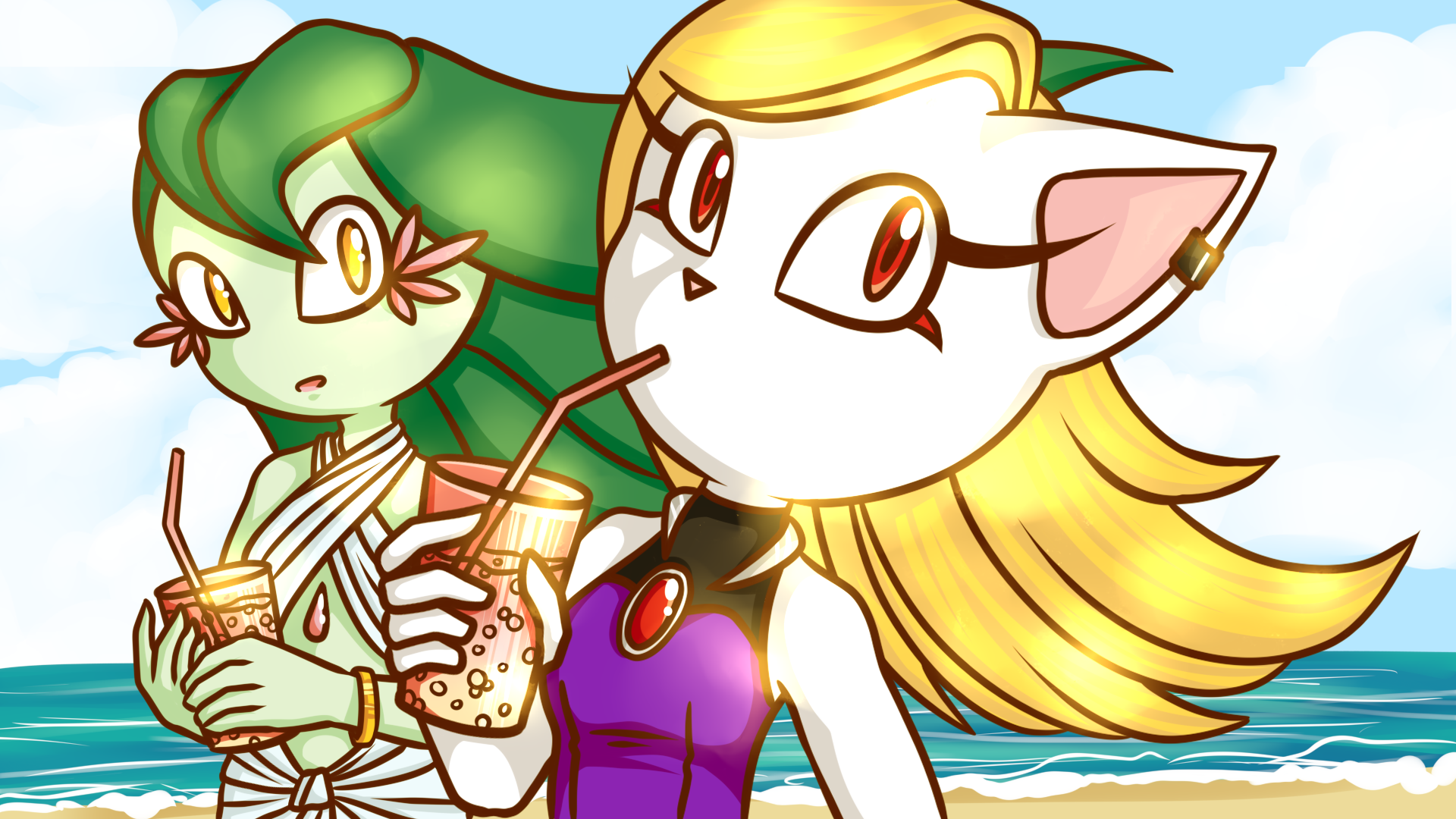**Miola Blossom** and **Christin Cat Bat** enjoying a drink at the beach. Miola is confused by the "new" Igolia and frequently observes her friend Christin to copy and figure things out this way.