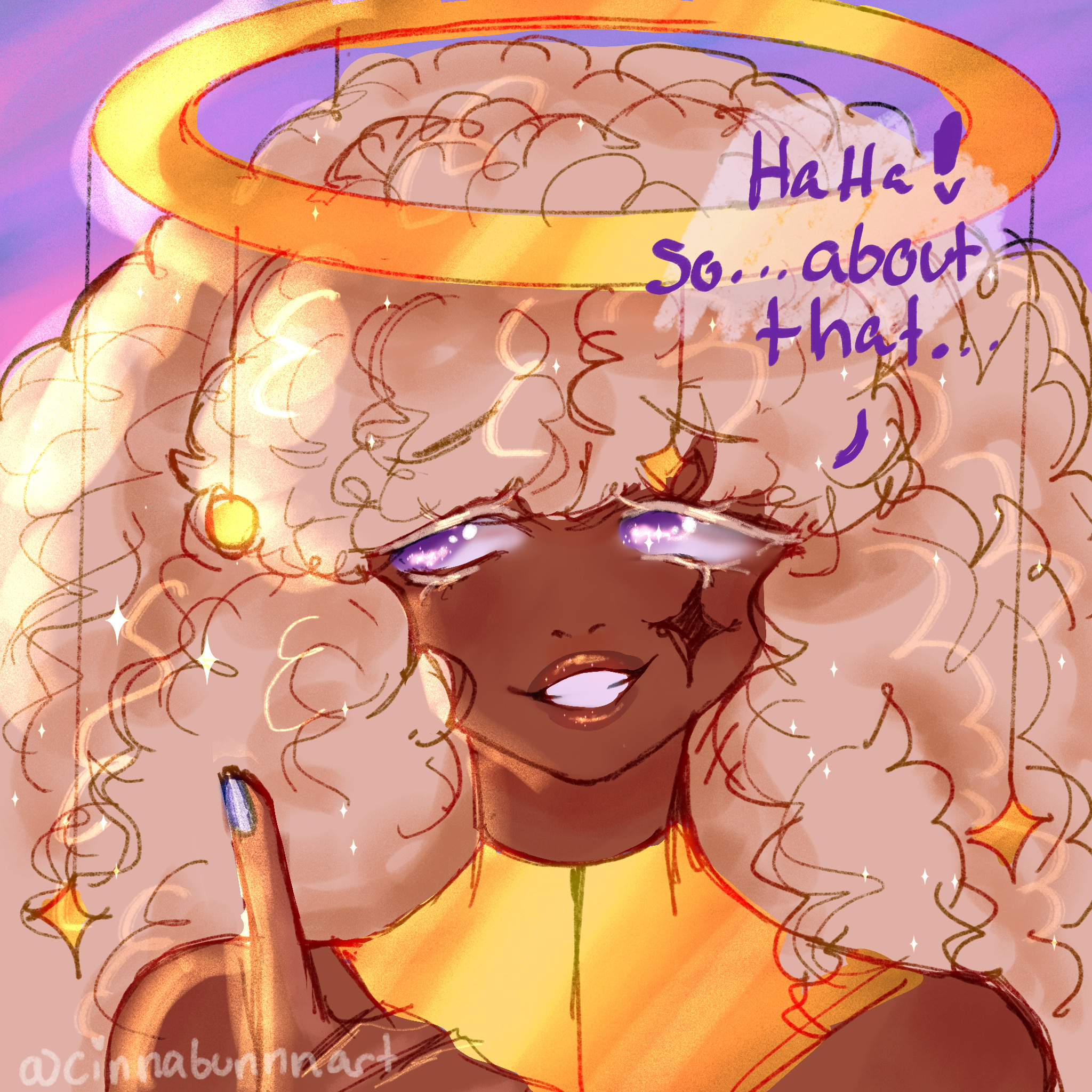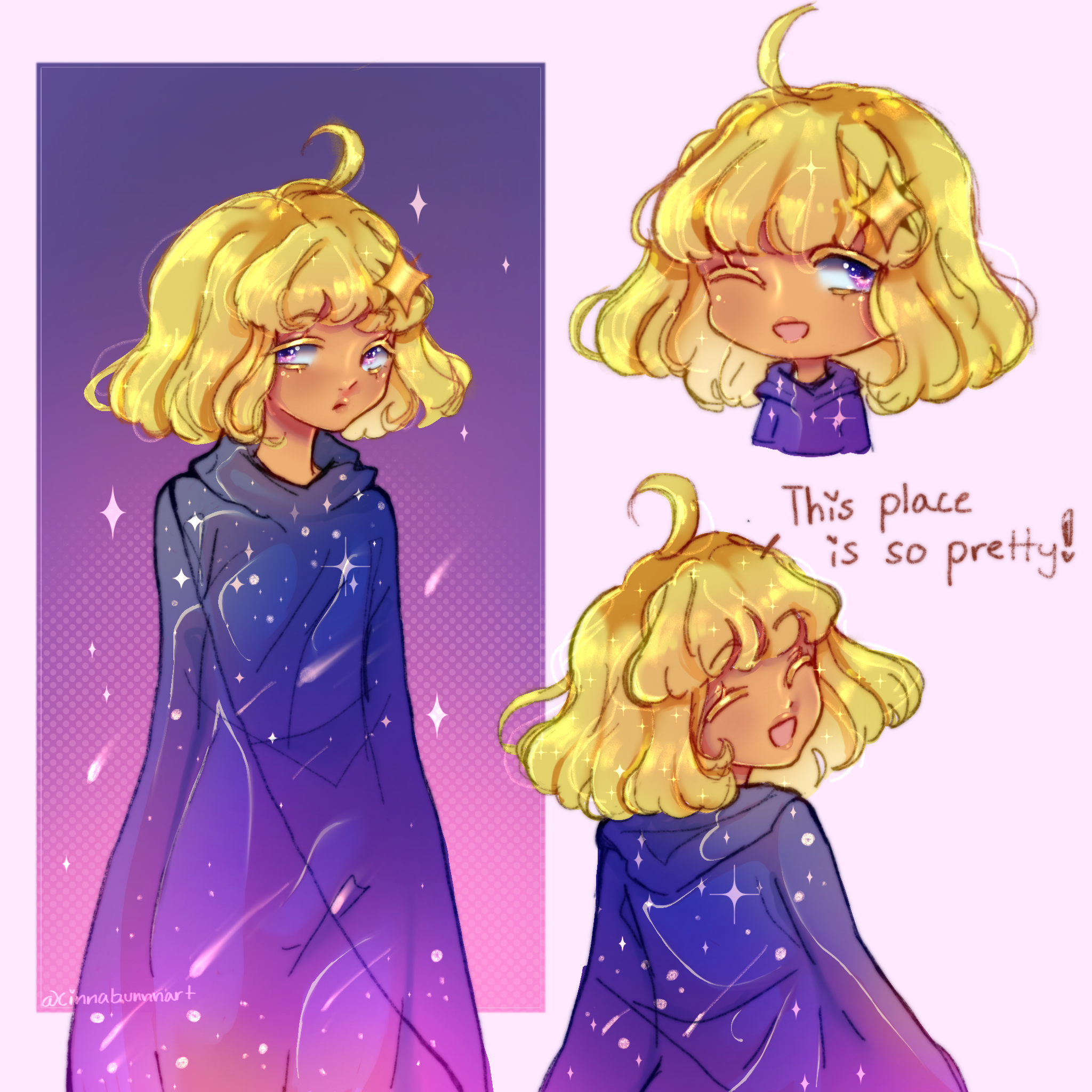 Stella is a big ball of energy and loves to explore and ask questions about everything! They love playing games or just flying around on their star platform just enjoying their surrounding. They are confident about who they are and what they want and wont change for anyone ^^ They are very positive but arent naive with the situation at hand.
