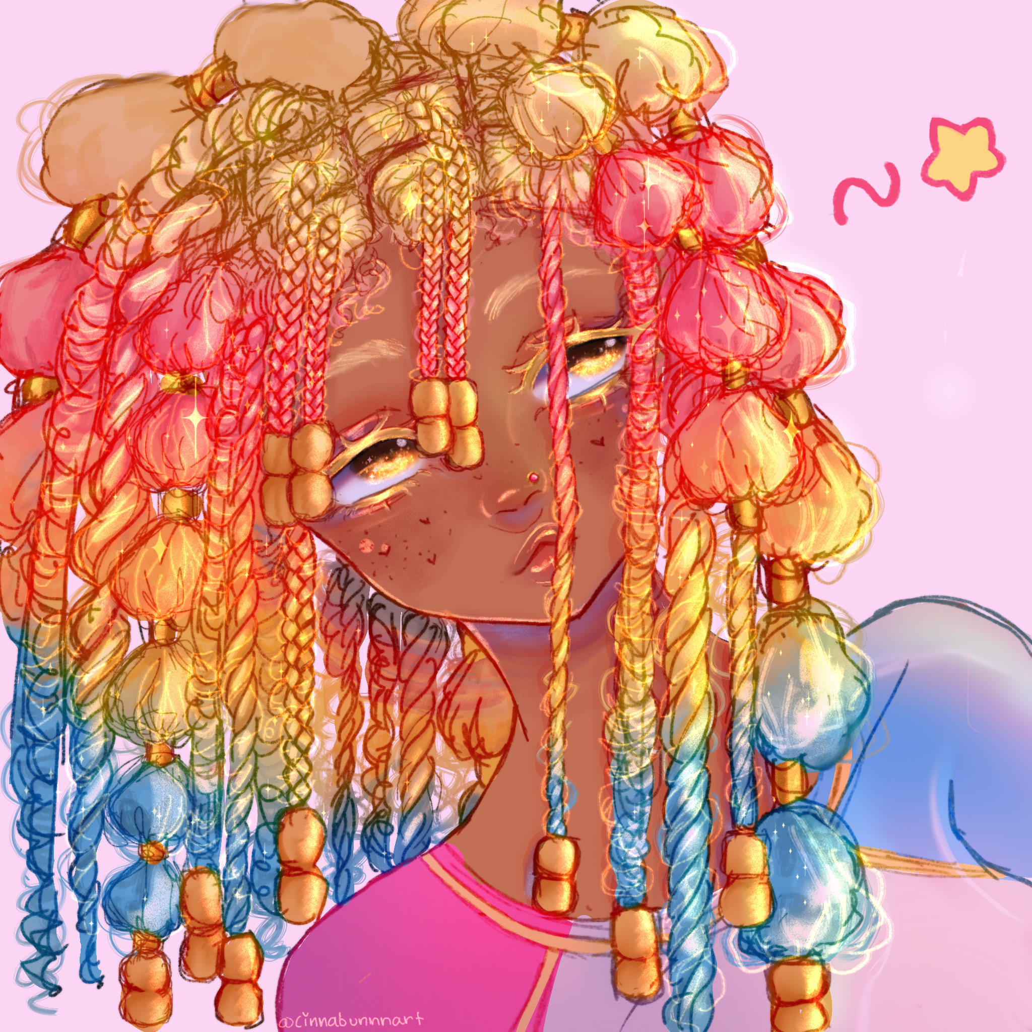 Im still a bit sick but starting to feel better! So i drew a girl with bisexual flag color twists with rainbow tinsel in them! Just thought it would be a cute hairstyle sooo i drew it x3 and ended up finishing the whole thing
