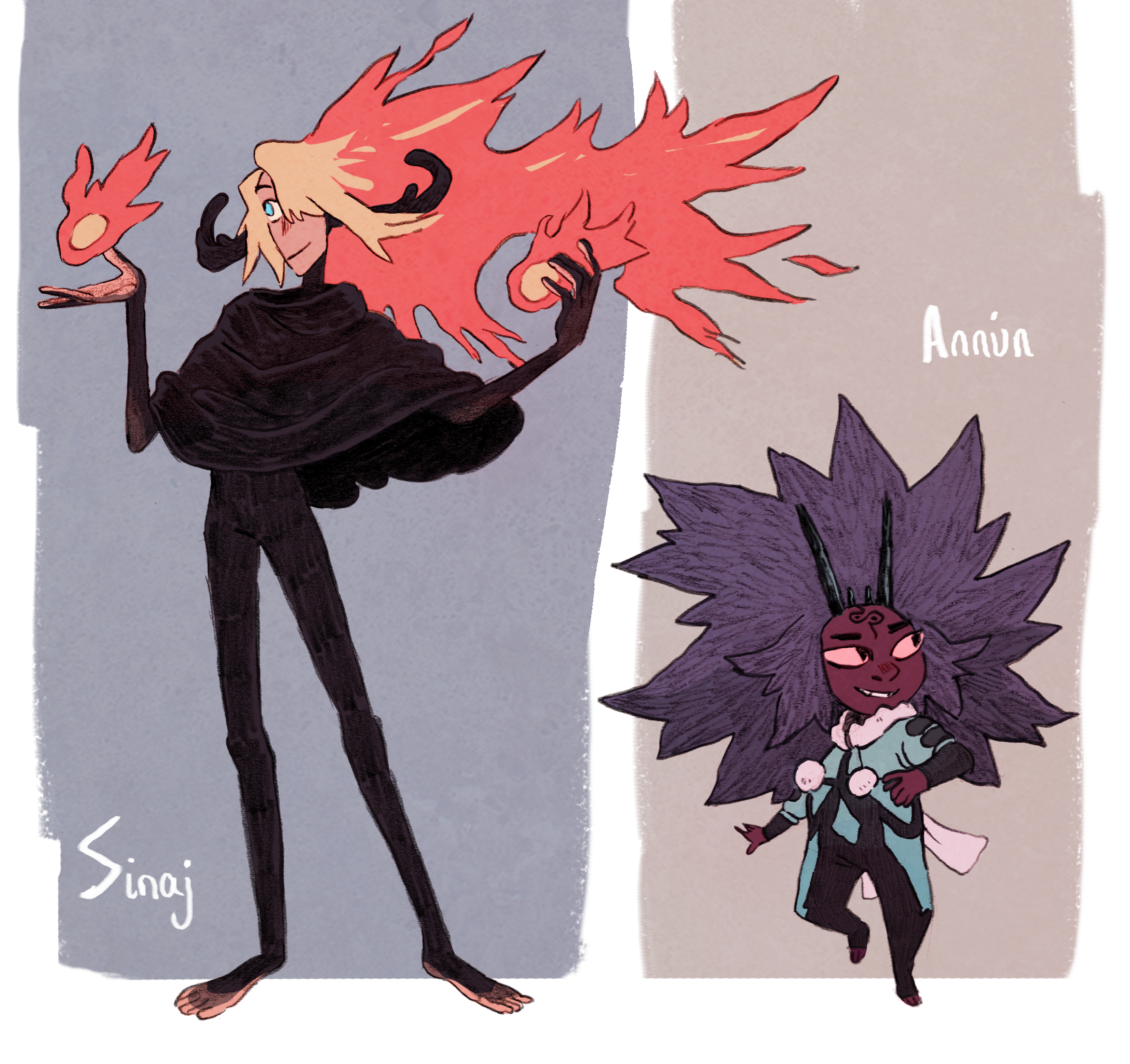 Sinaj and Annùn, from my webcomic on hiatus ([Headless Bliss](www.headlessbliss.com)), getting a bit of a redesign for a potential ""remake"" of the comic with house publishers!