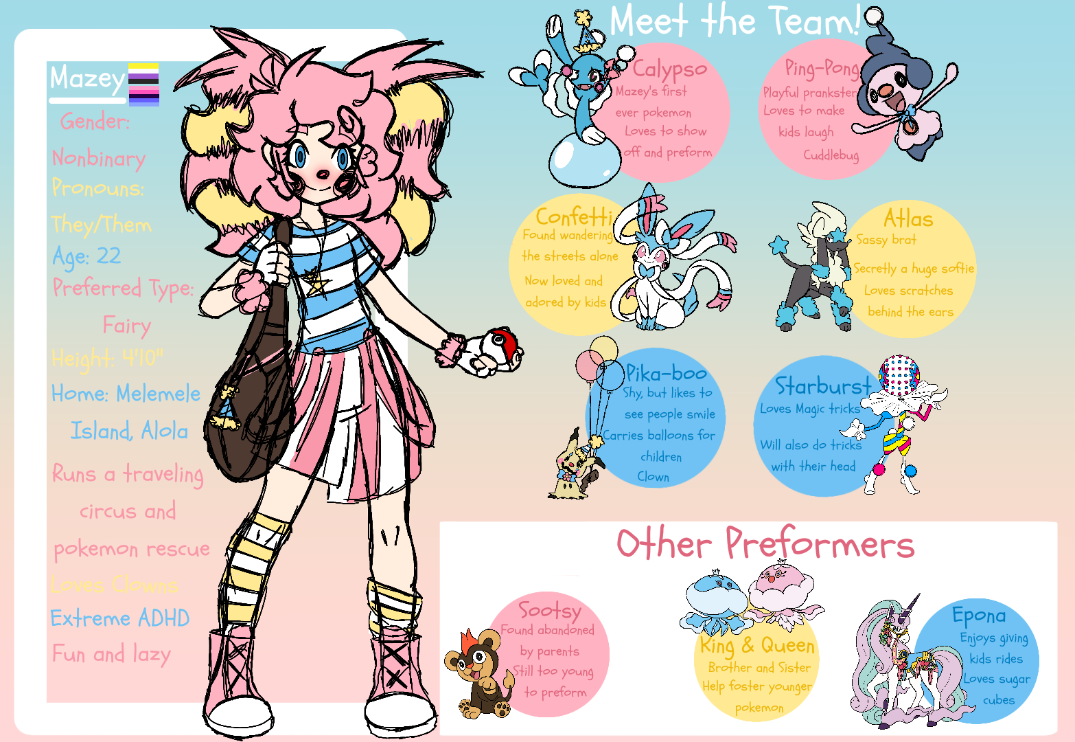 A ref sheet for my main oc, Mazey!! This is for the Pokemon AU, so it shows their team and their looks!! Feel free to ask any questions, I'd love to share some lore!!A ref sheet for my main oc, Mazey!! This is for the Pokemon AU, so it shows their team and their looks!! Feel free to ask any questions, I'd love to share some lore!!0 Comments 0 Shares 7 Views