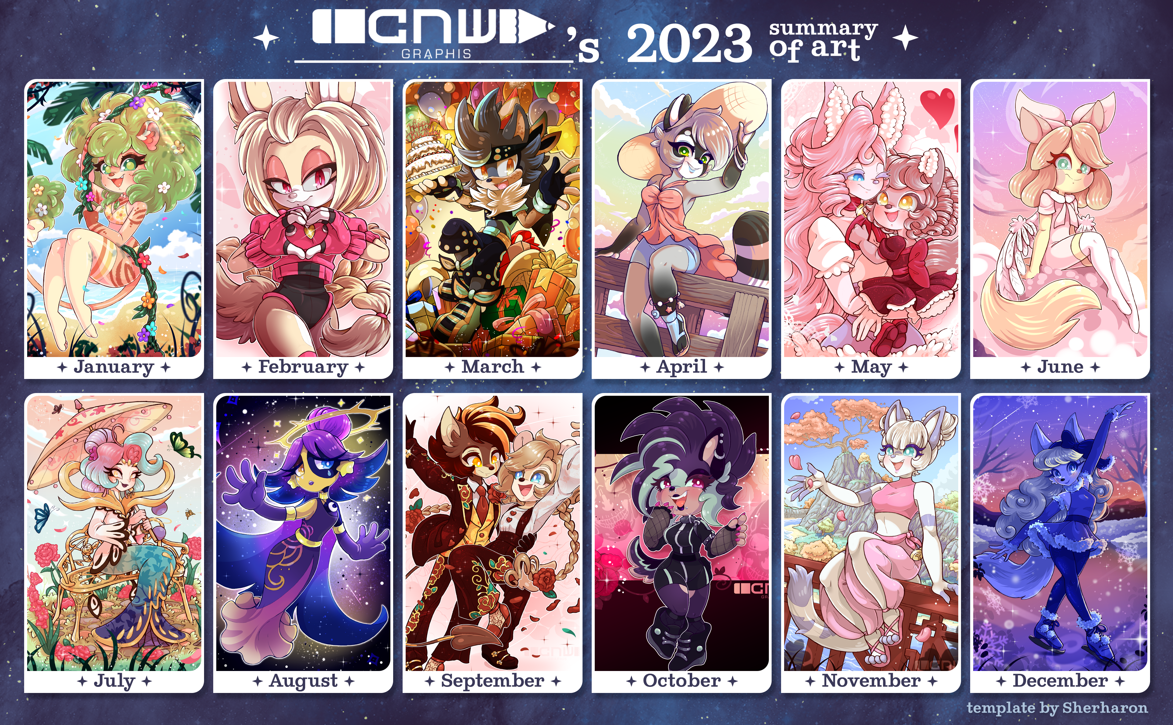 https://www.deviantart.com/sherharo.....late-941940013Happy New Year!!! I am glad I had time to do an art summary this year. I don't think I have done one for 2022. Anyways I hope you all have a wonderful 2024. I hope to try and do more with my art this year from commissions to collabs. But I have to learn how to be social first xD;;; Template By Sherharon: https://www.furaffinity.net/view/54867235/ https://www.deviantart.com/sherharo.....late-9419400130 Comments 0 Shares 27 Views