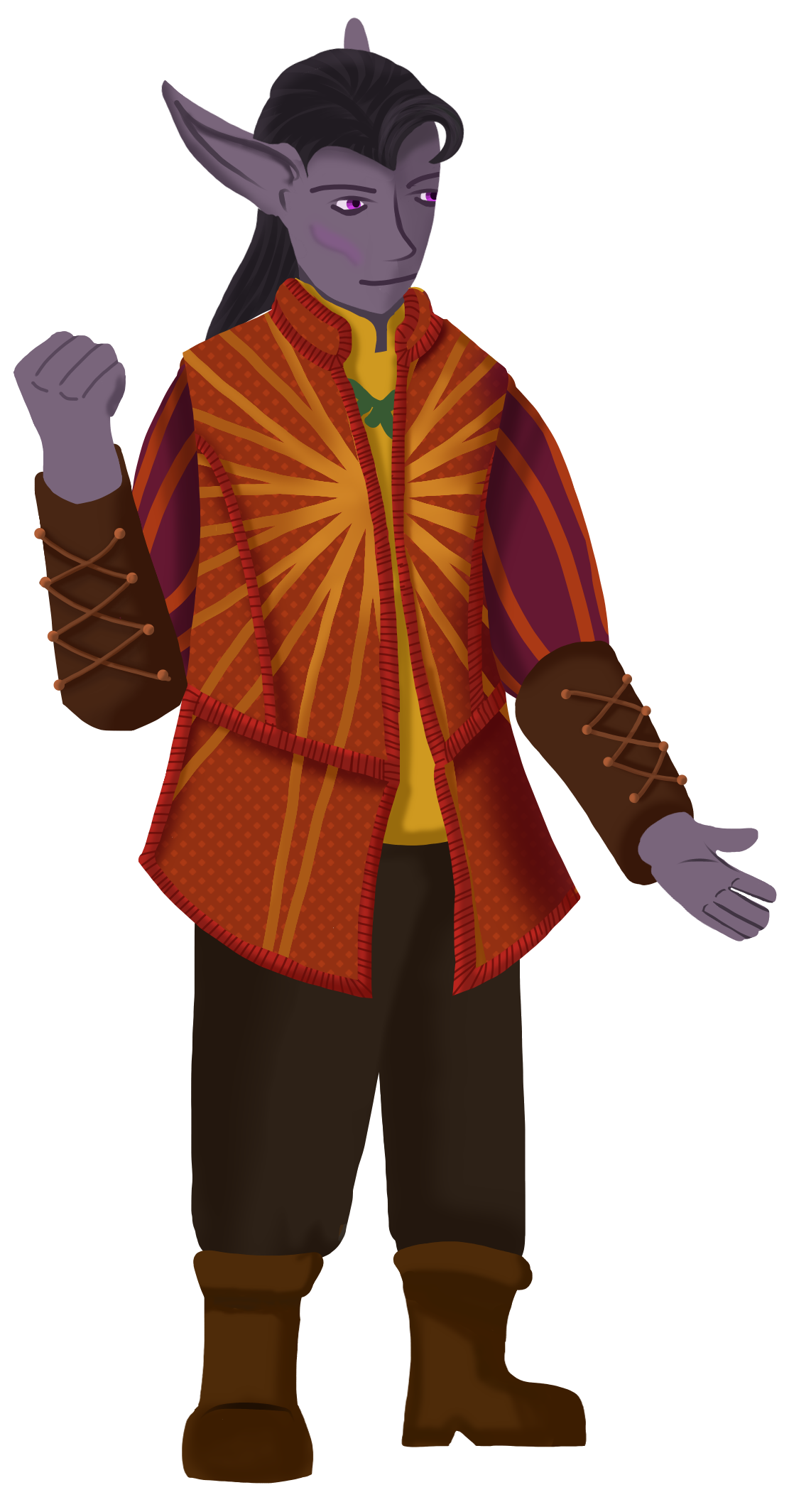 God this drawing...for the big spectacular Feywilde ball, I wanted to draw everyone going with a very impressive outfit. My initial idea was an autumn theme - a vest or something made entirely of leaves. So. There's a file on my computer somewhere with a horrific number of individual leaves I was going to attempt to copy-paste into a pattern or turn into a brush or something. Uhm. Needless to say, that idea didn't work out, so, sun theme instead! And Val still wins probably because I don't especially care for this drawing, ah well!Valanthe Liadon, the party's employer, finally gets art and oh my god does this guy not want to be drawn. Valanthe is a type of elf called an eladrin, who I swear were a different thing when I first looked them up than what 5E currently uses - in Temphere, they're elves native to the Feywilde, usually recognizable by purple skin and exceptionally long ears. Valanthe is lord of the party's home base and currently employees them, mostly to find the source of a very world-threatening-type looming danger but occasionally for more local purposes. God this drawing...for the big spectacular Feywilde ball, I wanted to draw everyone going with a very impressive outfit. My initial idea was an autumn theme - a vest or something made entirely of leaves. So. There's a file on my computer somewhere with a horrific number of individual leaves I was going to attempt to copy-paste into a pattern or turn into a brush or something. Uhm. Needless to say, that idea didn't work out, so, sun theme instead! And Val still wins probably because I don't especially care for this drawing, ah well!0 Comments 0 Shares 29 Views -