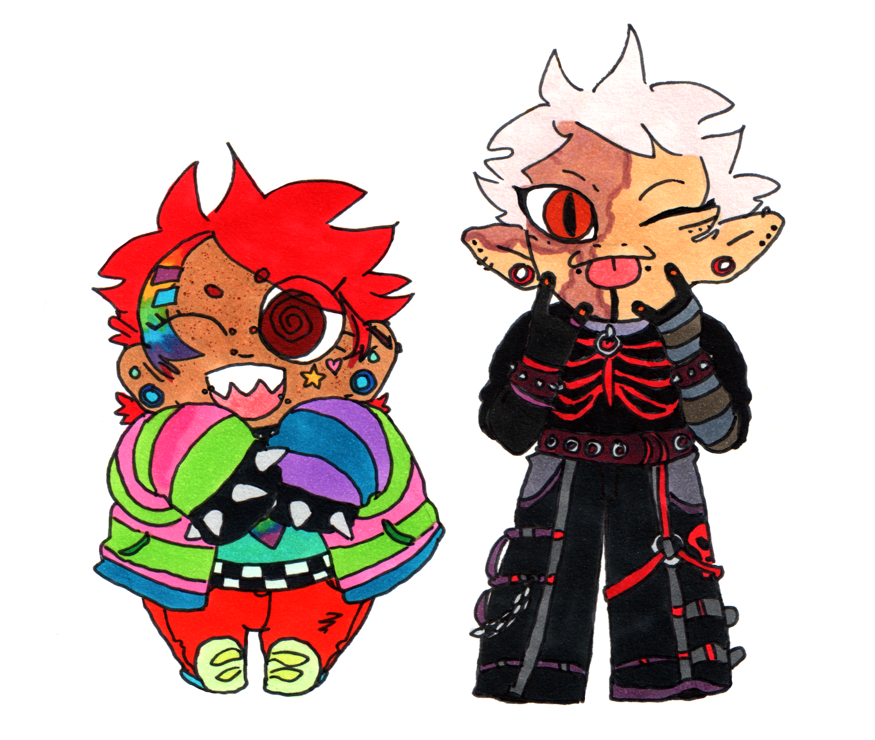 image description: [chibi drawings of hana and bonic from kings of sorts. hana is a short, chubby, tan elf with scruffy red hair and freckles. bonic is a tall, skinny, white haired elf with a large scar down half his face. hana is dressed in a colorful scene outfit, with an oversized sweatshirt with spikes at the ends of his sleeves, covering his hands. he has a rainbow streak in his hair. bonic is dressed in a goth outfit: a black shirt with red ribs on it, spikey bracelets, one striped sleeve, and wipe, black tripp pants.]they are boyfriends image description: [chibi drawings of hana and bonic from kings of sorts. hana is a short, chubby, tan elf with scruffy red hair and freckles. bonic is a tall, skinny, white haired elf with a large scar down half his face. hana is dressed in a colorful scene outfit, with an oversized sweatshirt with spikes at the ends of his sleeves, covering his hands. he has a rainbow streak in his hair. bonic is dressed in a goth outfit: a black shirt with red ribs on it, spikey bracelets, one striped sleeve, and wipe, black tripp pants.]0 Comments 0 Shares 30 Views -