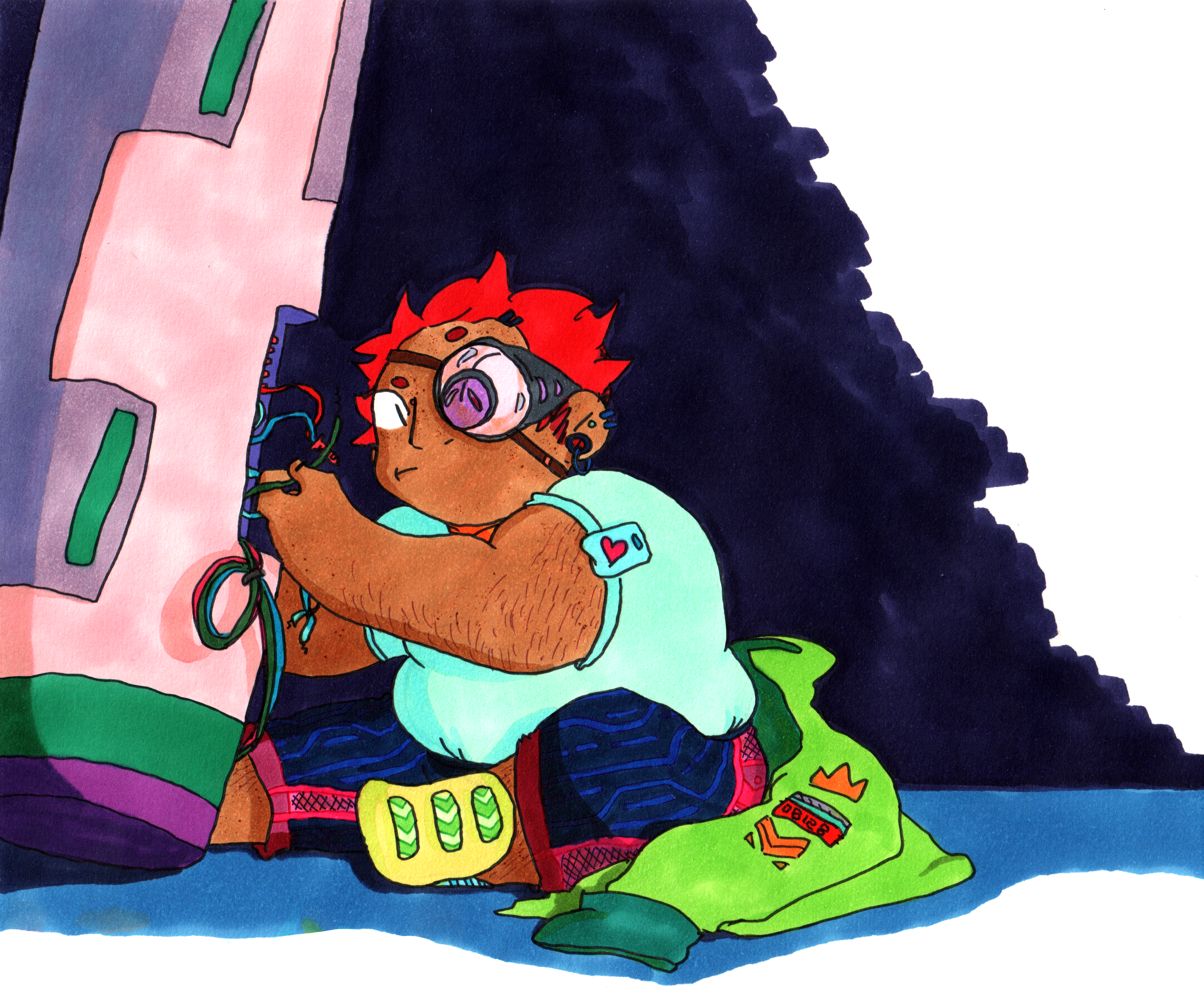 image description: [hana from the webcomic kings of sorts, sitting on the floor and studying some wires coming out of a large pink and purple cylinder, with green detailing. hana is a short chunky dwarf with shaggy red hair, a nostril piercing and a bridge piercing, and several ear piercings, including a single teal earring. he's wearing a light blue shirt with a heart on the sleeve, capris with pink mesh on the sides and blue line patterning, and bright yellow green sneakers. there's an magnifying eyeglass strapped to his head. behind him, as if he shrugged it off, is a bright green labcoat with teal detailing.]someone get this guy to bed. image description: [hana from the webcomic kings of sorts, sitting on the floor and studying some wires coming out of a large pink and purple cylinder, with green detailing. hana is a short chunky dwarf with shaggy red hair, a nostril piercing and a bridge piercing, and several ear piercings, including a single teal earring. he's wearing a light blue shirt with a heart on the sleeve, capris with pink mesh on the sides and blue line patterning, and bright yellow green sneakers. there's an magnifying eyeglass strapped to his head. behind him, as if he shrugged it off, is a bright green labcoat with teal detailing.]0 Comments 0 Shares 29 Views -