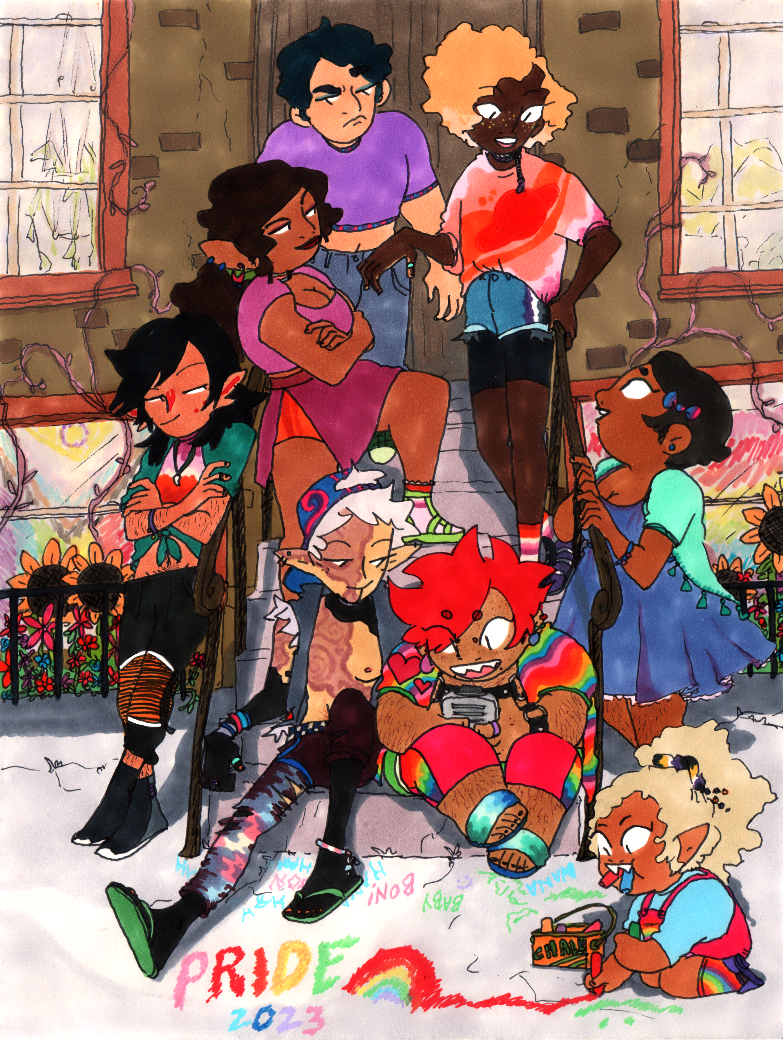 in front of the stairs, there's chalk name writing practice (hana teaching bon and baby). bon has practiced writing parts of hana's name several times. on the bottom reads: "PRIDE 2023" with a rainbow next to it. ]they are waiting to go to a festival. or a parade. idk. image description: [the kings of sorts main cast sitting on stairs outside a brick building. all their outfits contain pride flag colors. from top to bottom, left to right: marek (bi), aoife (lesbian), teraat (lesbian, asexual), kiigari (lesbian, nonbinary), chaarose (bi), bonic (bi, trans), hana (gay), and baby (nonbinary and rainbow. she doesn't know yet, she's a baby). marek is glaring at aoife. he's trying to go down the stair to get in-between hana and bonic, but aoife is stopping him. tera is leaning on the railing to talk to chaar, who is on the ground looking up at her. kiigari smiles at the antics of them all. hana is hunched over, playing on a gameboy, super excited about whatever is going on. bonic looks over his shoulder fondly. baby is playing with and eating chalk. in front of the stairs, there's chalk name writing practice (hana teaching bon and baby). bon has practiced writing parts of hana's name several times. on the bottom reads: "PRIDE 2023" with a rainbow next to it. ]0 Comments 0 Shares 29 Views -