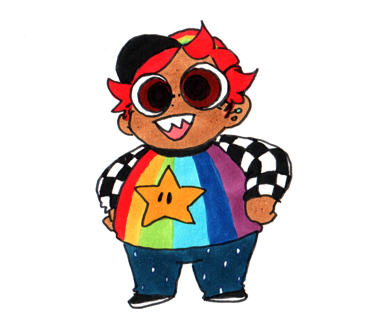 image description: [hana, a short, fat dwarf with tan skin, freckles, and scruffy red hair, wears mario's rainbow road themed outfit. the chest is a rainbow, the arms are checkered black and white, the pants are blue with small white spots, and he's wearing a rainbow hat as well. ]this mario outfit seemed very hana image description: [hana, a short, fat dwarf with tan skin, freckles, and scruffy red hair, wears mario's rainbow road themed outfit. the chest is a rainbow, the arms are checkered black and white, the pants are blue with small white spots, and he's wearing a rainbow hat as well. ]0 Comments 0 Shares 29 Views -