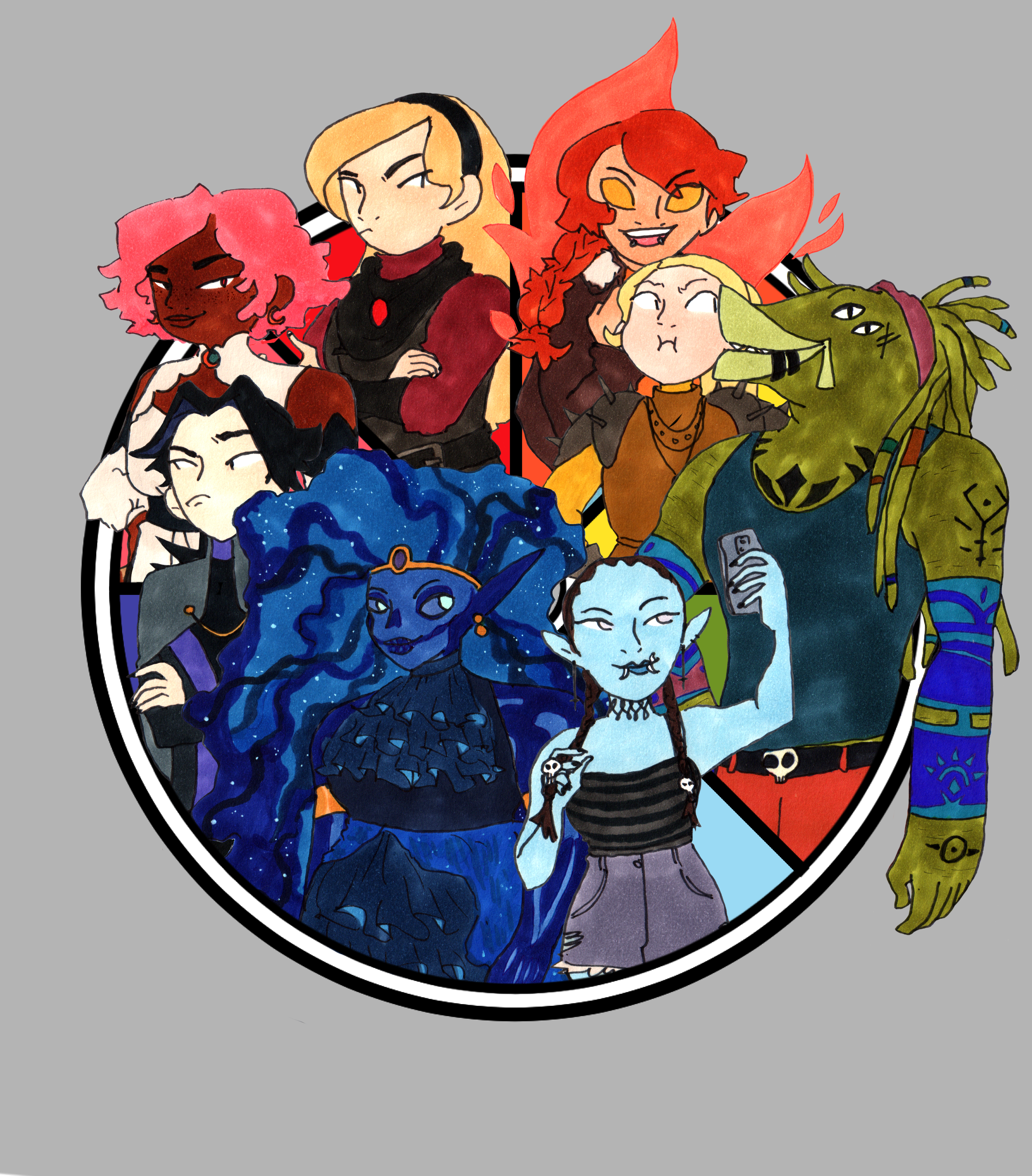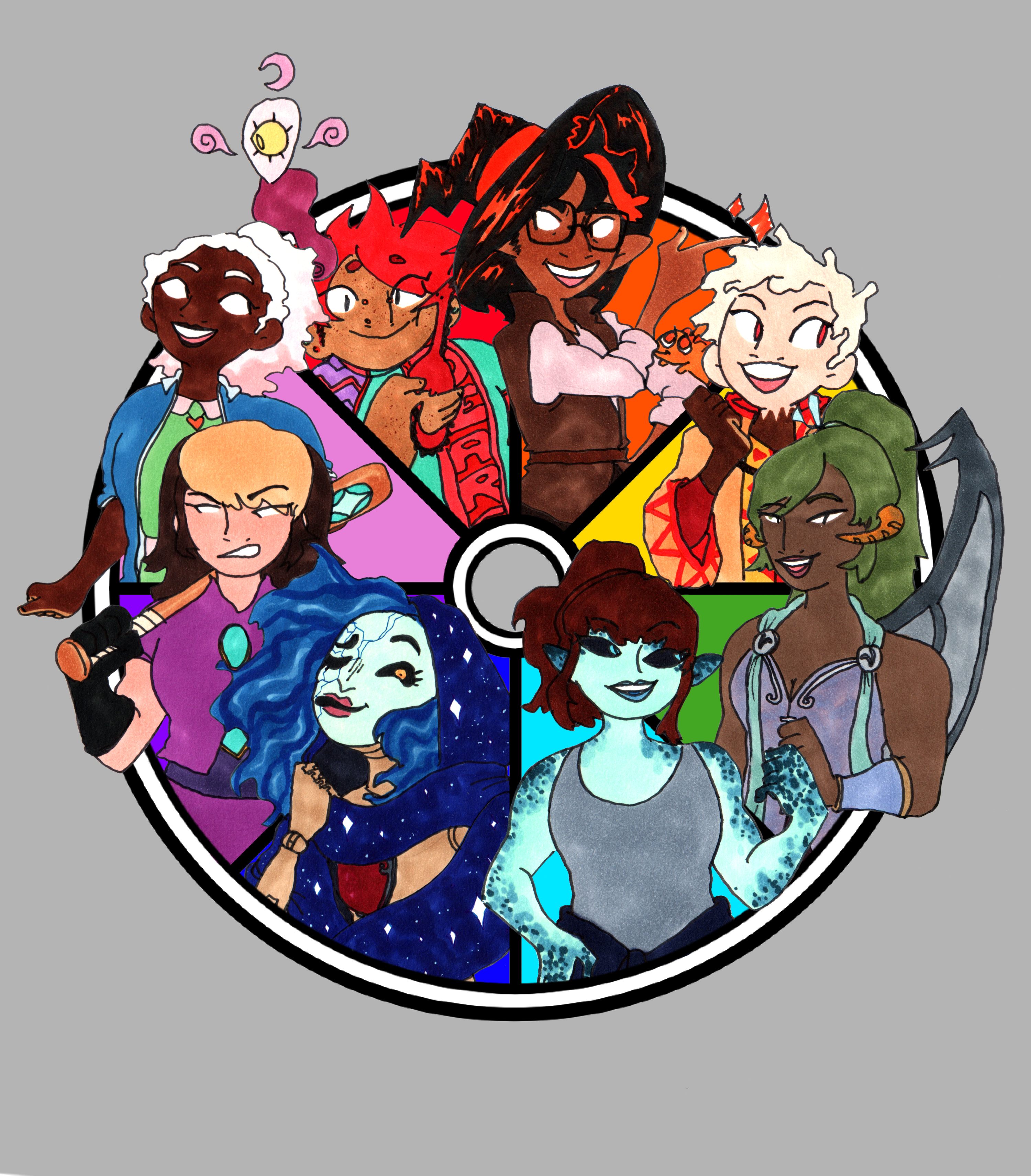 image description: [a color wheel, with arianna from castoff on red, tiara from wychwood on orange, puffer from puffer and clarissa on yellow, boggmouth from ghost junk sickness on green, yineshe from witch heart on blue, queen astralis from jack beloved on indigo, damien from brothers on purple, and begonia from countdown to countdown on pink.]