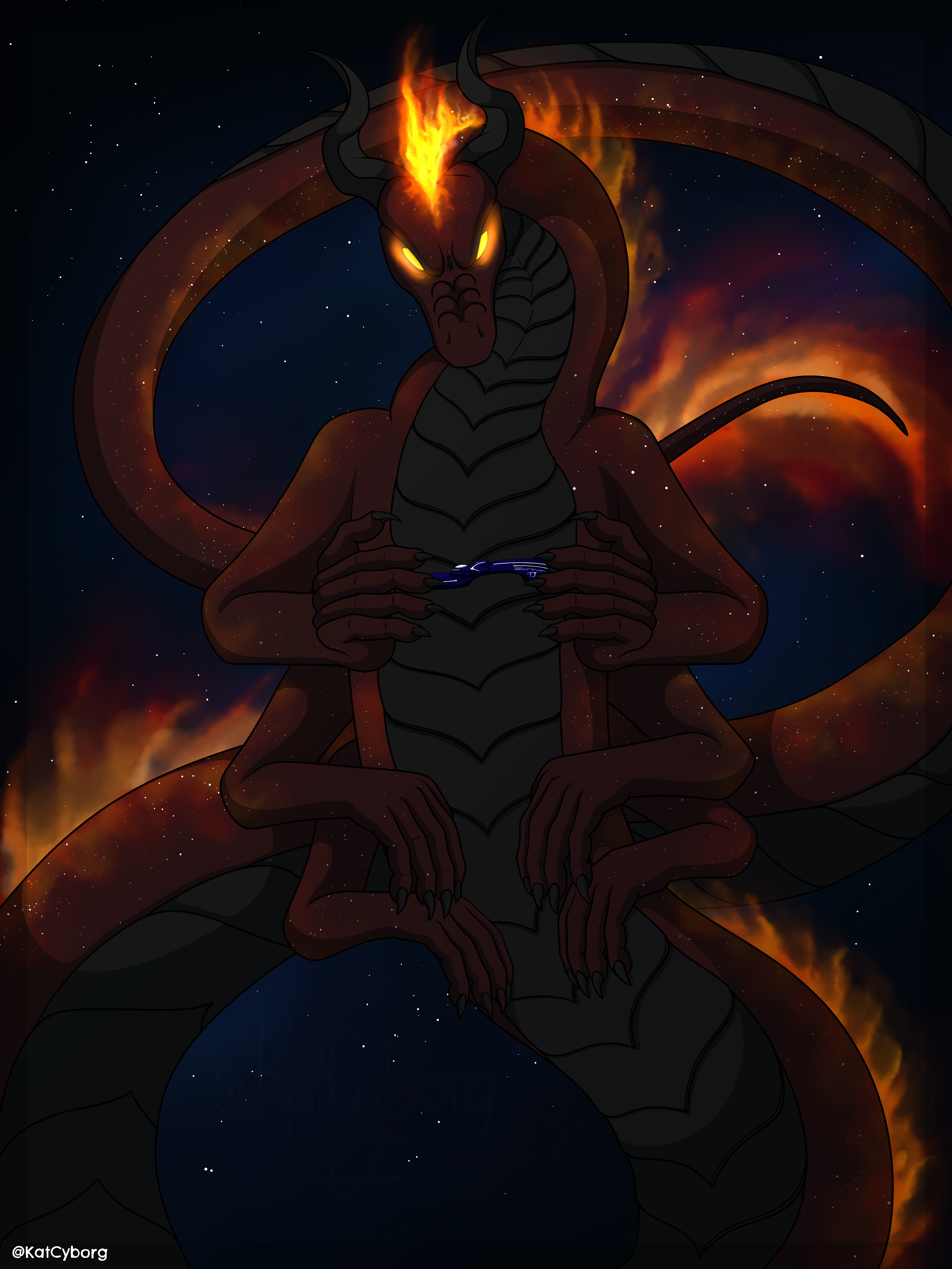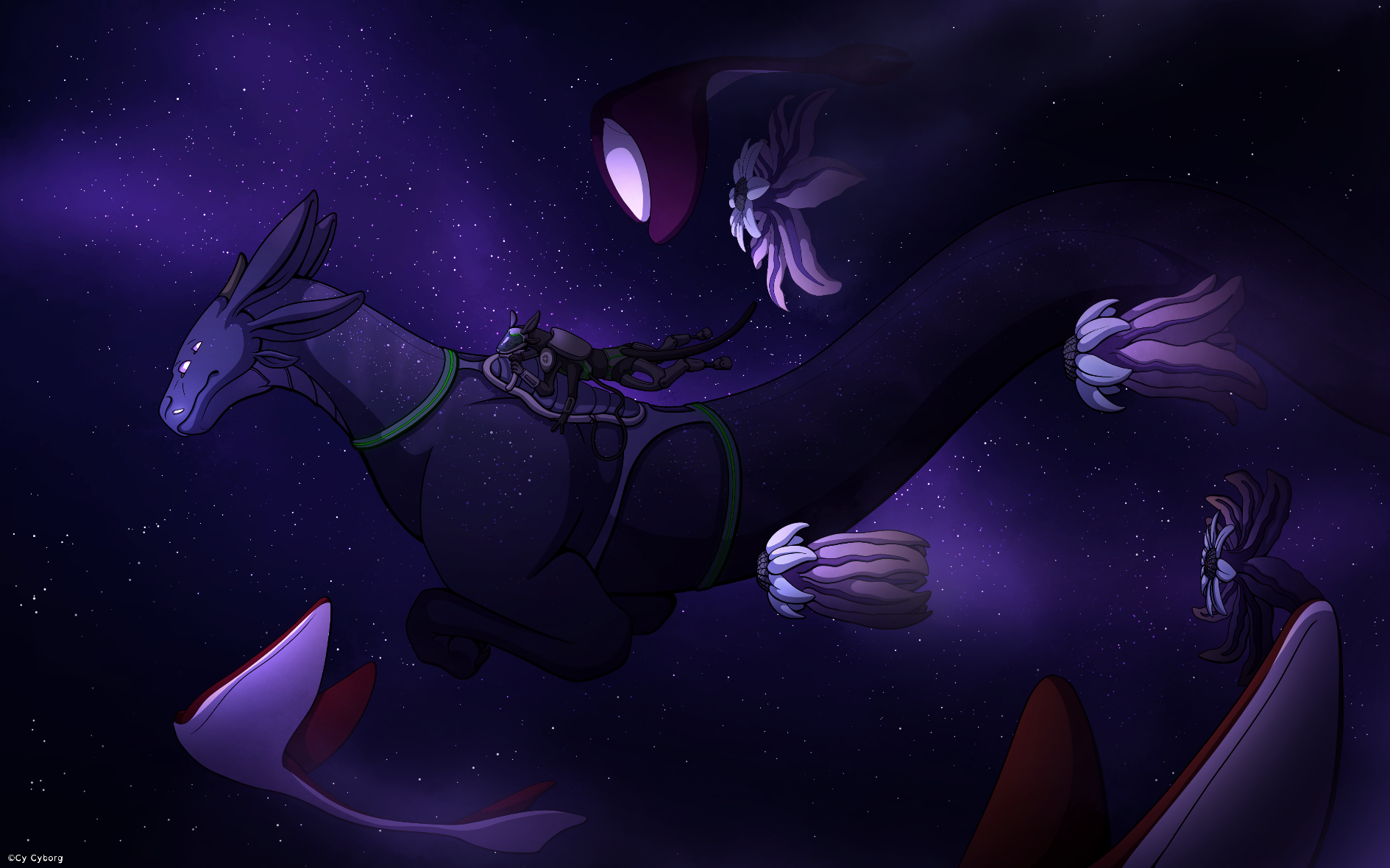 In the comic, Ravu (the dragon) is absolutely TERRIFIED of Purnekels: completely harmless jellyfish/flower-like creatures that float around in the vacuum of space. They have about as much ability to hurt you as an actual flower, but this does little to calm Ravu - their natural predator. So Xari decides to go out into space with them to help them confront their fear. This scene takes place towards the end of the comic, which is why Ravu is so big (though still very far from an adult!)My art tablet died a few days ago, so this is my first drawing using my old Intuos (screenless) tablet since...2015? I think I did pretty well considering how rusty I am with it! I thought some Voidstar concept art would be a good subject to test it out on! In the comic, Ravu (the dragon) is absolutely TERRIFIED of Purnekels: completely harmless jellyfish/flower-like creatures that float around in the vacuum of space. They have about as much ability to hurt you as an actual flower, but this does little to calm Ravu - their natural predator. So Xari decides to go out into space with them to help them confront their fear. This scene takes place towards the end of the comic, which is why Ravu is so big (though still very far from an adult!)0 Comments 0 Shares 25 Views -