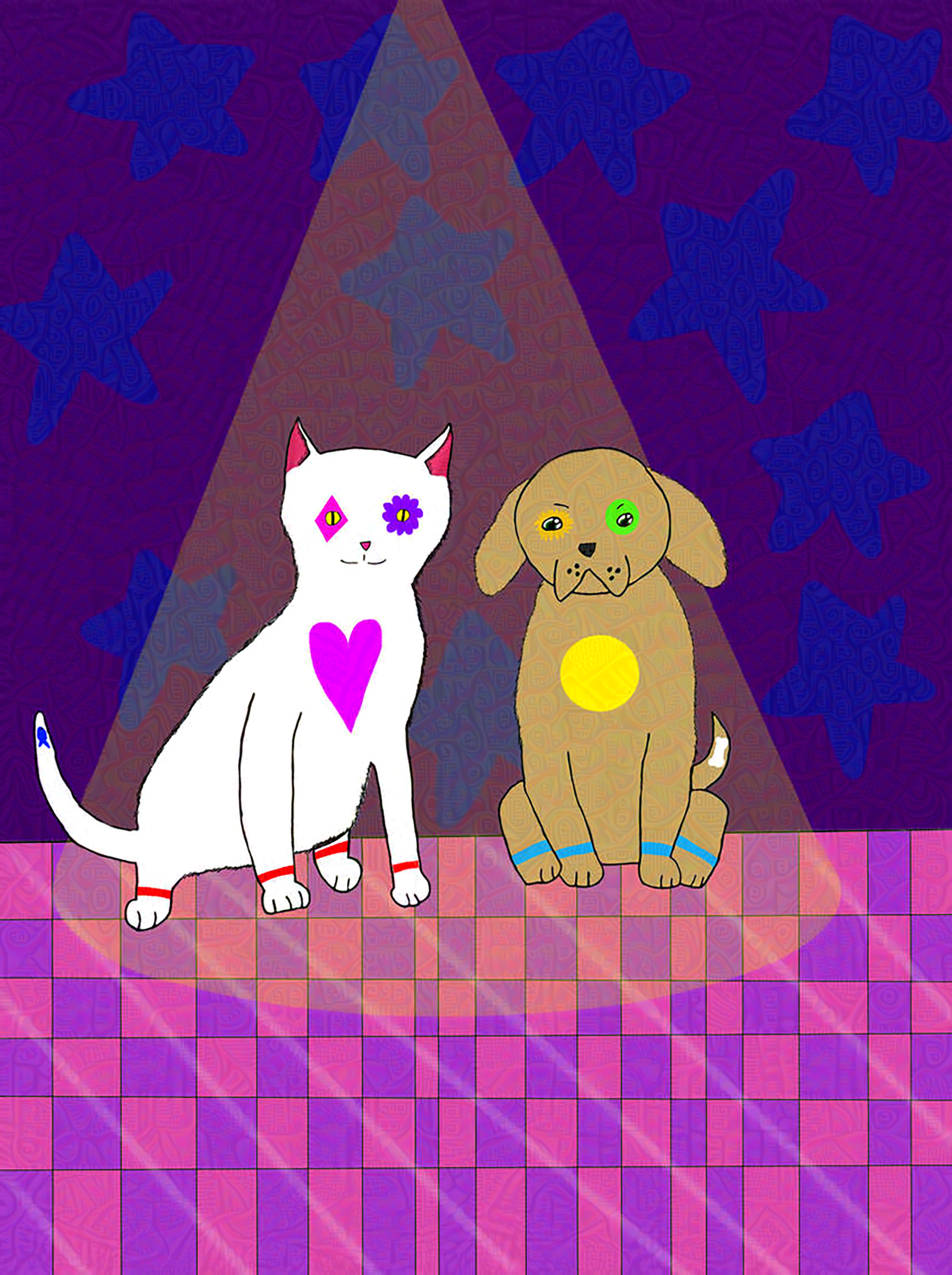 This is being done for the Secret Santa which I drew this out having kitten and puppy having a dance club with neon paintings on them.