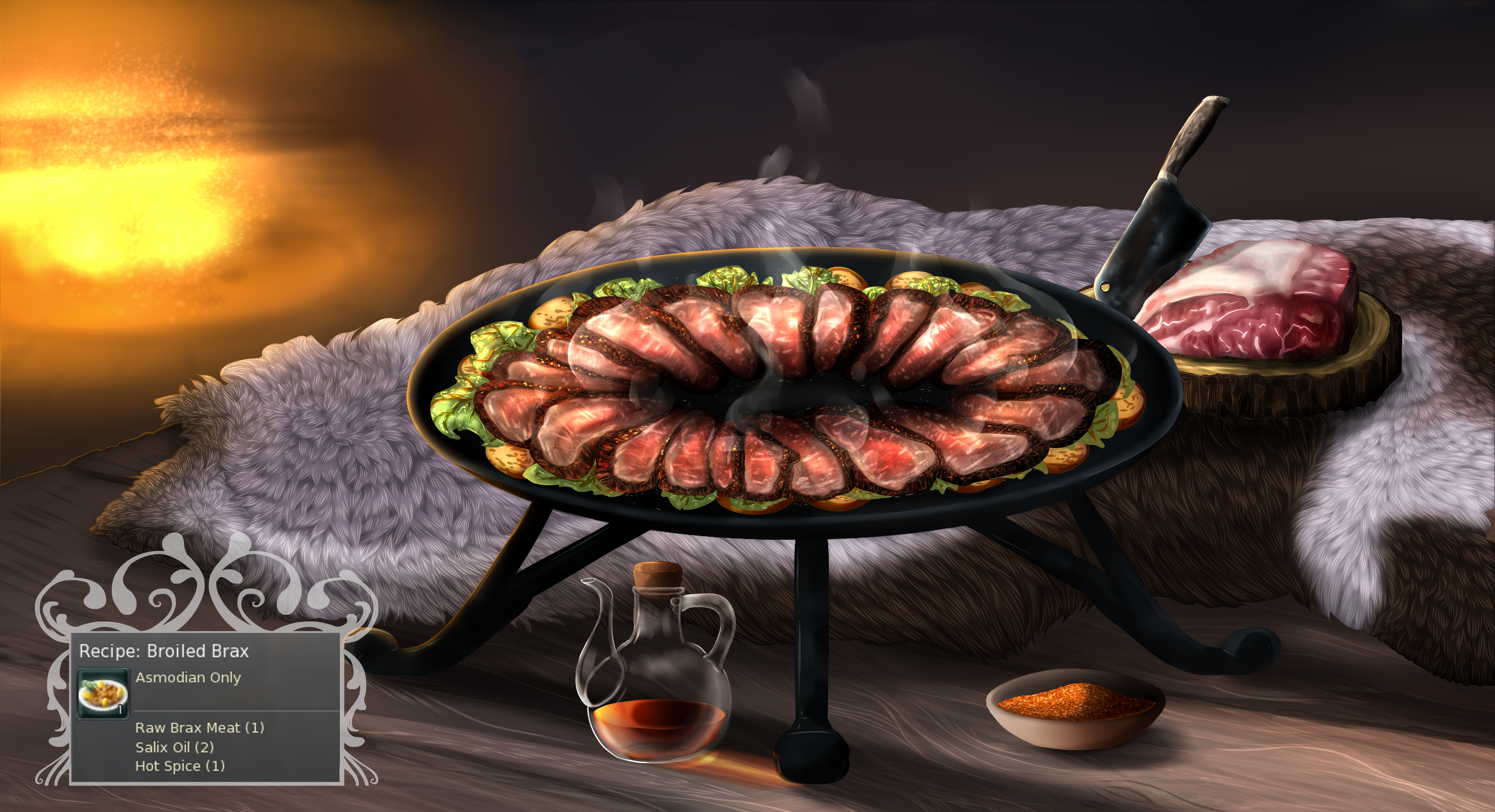 OG Published: Dec 9, 2021/ MMORPG Aion published by NCsoft ------ 🙥 Broiled Brax 🙧 The Brax is a big, bison like, frugal and hardy herbivore that comes in a few different subspecies in all of Atreia. Its undemanding and gentle nature lead to it being domesticated more than just once and is mainly used for its meat, hide, leader and horns as well as a beast of burden. For this dish, the fresh sirloin meat will be prepared with hot spices and broiled with Salix oil, giving it a slightly woody, nutty flavour. Accompanying and rounding out the meaty meal are boiled, sliced and - if desired - broiled Krimer with steamed Horto leaves. Enjoy! And dig in, before someone else does it for you. ------ Paint Tool Sai / Wacom Intuos pro M PTH 651 ------0 Comments 0 Shares 24 Views -