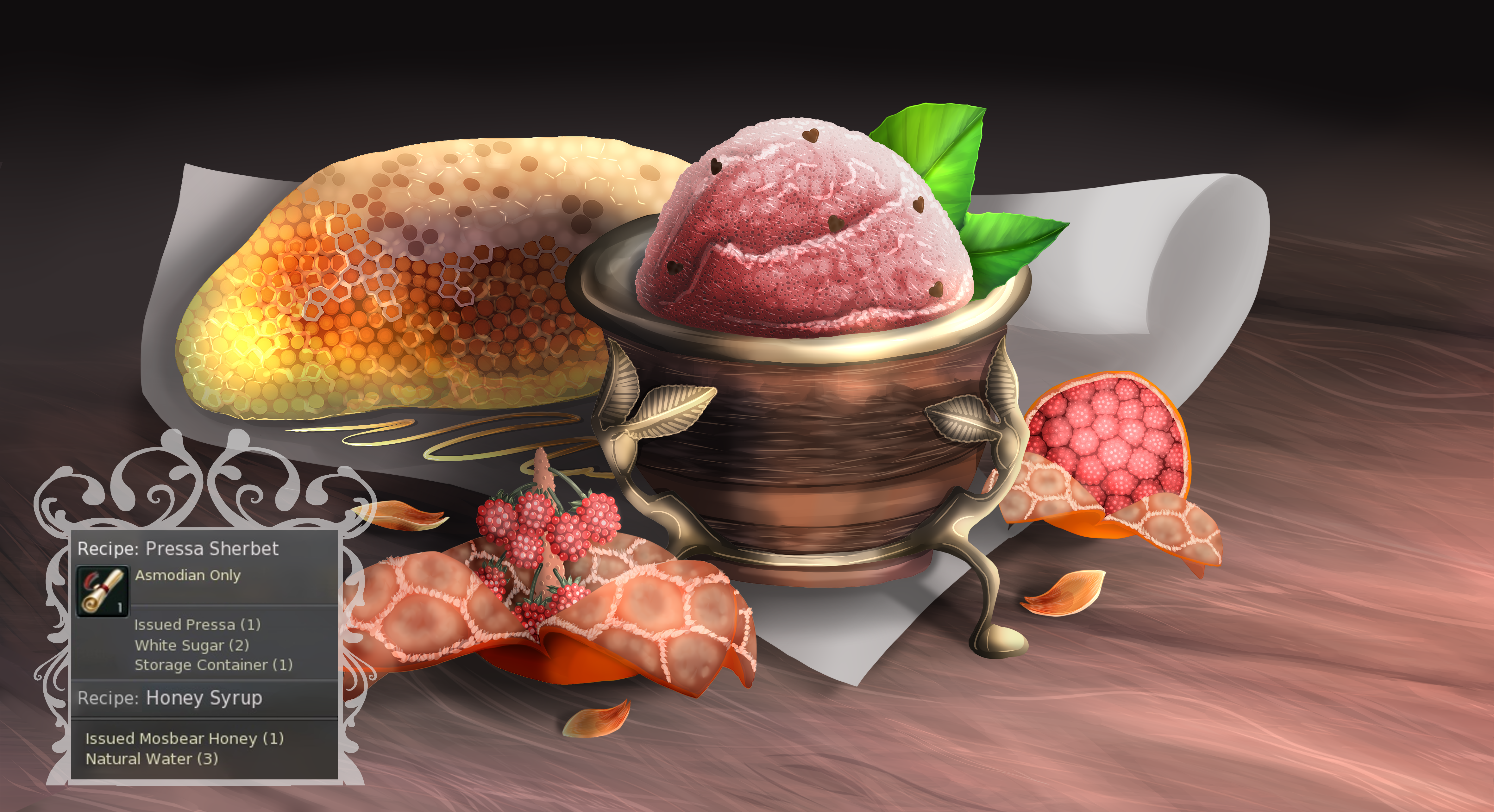 OG Published: Feb 12, 2022 / MMORPG Aion published by NCsoft ------ 🙥 Pressa Sherbet and Honey Syrup 🙧 Native to Morheim and Beluslan, Pressa is a very hardy bush, growing in rather muggy up to freezing cold climates. The plant clones itself over root shoots, rather than using its seeds to spared. One reason for the phenomenon, that Presser is rarely found alone, but mostly been seen surrounded by its kin of the same hight and growth. Sought out for its flower petals, used to dye fabric, Pressa is also known for its aggregate fruit, kept safe by an outer, orange like peel. The fruit itself is medium firm and has a subtle sweetness with of floral or roselike note to them. It can be eaten raw, as well as processed into different dishes. Some very fancy way to put this fruit to a use, is to make a Sherbet. For this, the fruit will be frozen, pureed and sifted to get out all its small seeds. Sweetened with sugar and put to a fitting container, it will be frozen one more time, before served. But what about some small chocolate hearts, to make this special dish even more fitting as a lovely first course? Sweet thooths and heart alike will not be able to resist this treat! But what’s that? You want to serve even more sweet treats? What about a true delicacy, hard to obtain and only found in Altgard? Then Mosbear honey will be the right choice. Raw combs are known as the gold of this region and it’s super sweet and thick honey, of a grounded, aromatic, rich herbal taste is often watered down and made into syrup, to provide it to even more people. ------ Paint Tool Sai / Wacom Intuos pro M PTH 651 ------0 Comments 0 Shares 20 Views