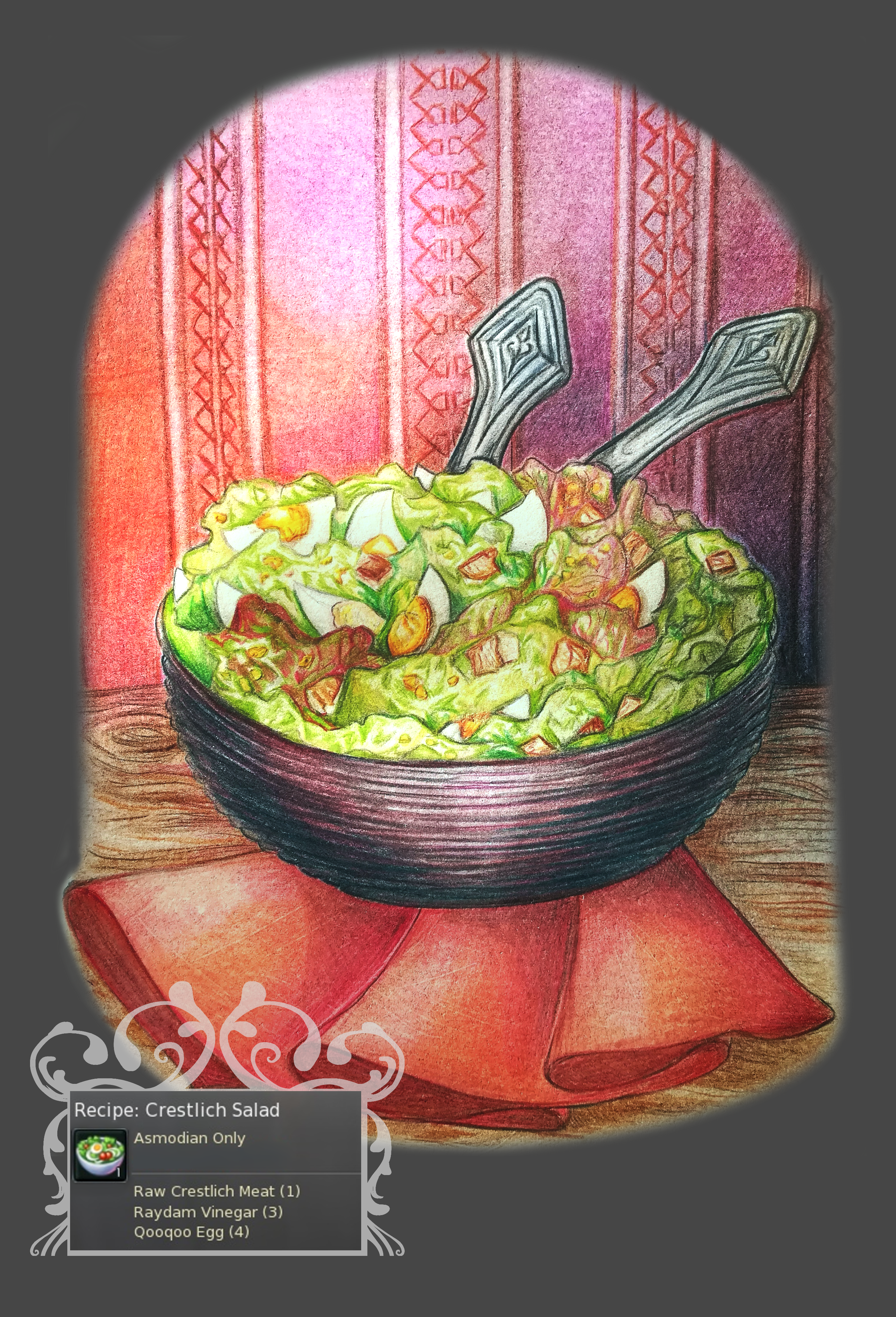 ------OG Published: Aug 30, 2022 / MMORPG Aion published by NCsoft ------ 🙥 Crestlich Salad 🙧 The Raydam is an apple like, juicy fruit found in Altgard, that is more sweet and mild in its’s taste than source. The small bush likes to grow on sandy, meadowy grounds, where enough of the pale sunlight reaches it leaves and fruits, as well as keeping the roots warm.Though surly it can be eaten raw, Raydam will be used for all kinds of purposes. Juice, Candy, Curry, in today's focus: Raydam Vinnegar. Raydam vinegar is very mild and more on the sweeter side and therefore perfectly suited for Salads. Together with Puchida, it will form the starting base of our salad. Puchida is a common farmed type of leaf vegetable, that comes both in a red green and a red purplish variant. And now to the name giving ingredient, the Crestlich. This big, flightless bird is found in different areas around Atreia, most preferably deserts, steps or grasslands, where they can overlook their grounds and see danger coming from afar. They are rather shy and timid birds, and will choose flight over fight despite their size and are not aggressive as other birds of their size. They have a call, to warn fellow kin, tho can attack, when flight alone is no solution. Their tender, even breast meat is the best choice for a salad, but depending on what is available, other meatparts can be used too. The meat can be boiled, broiled or cooked in the oven, suited to one's tastes and preferences. After that, it will be cut into strips, preferably half a claw length long and half that amount wide. Another measure can be the hard boiled eggs, as it should always be smaller than these. The eggs for the salad, preferably come from the Qooqoo, a domesticated fowl, looking like a mixture of a rooster and a duck. Showing no sexual dimorphism, Genders can only be identified by behavior, as males fight each other and hens provide the owner with daily laid eggs. Take 4 eggs and wax - or hard boil them. Quarter each egg and gently fold them in last, to not break them too much. Done! An easy, fast salad, balancing both light animal products with greens. ------ Drawn on paper and colored pencils / Traditional / Frame and recipe done in Paint Tool Sai ------0 Comments 0 Shares 23 Views -
