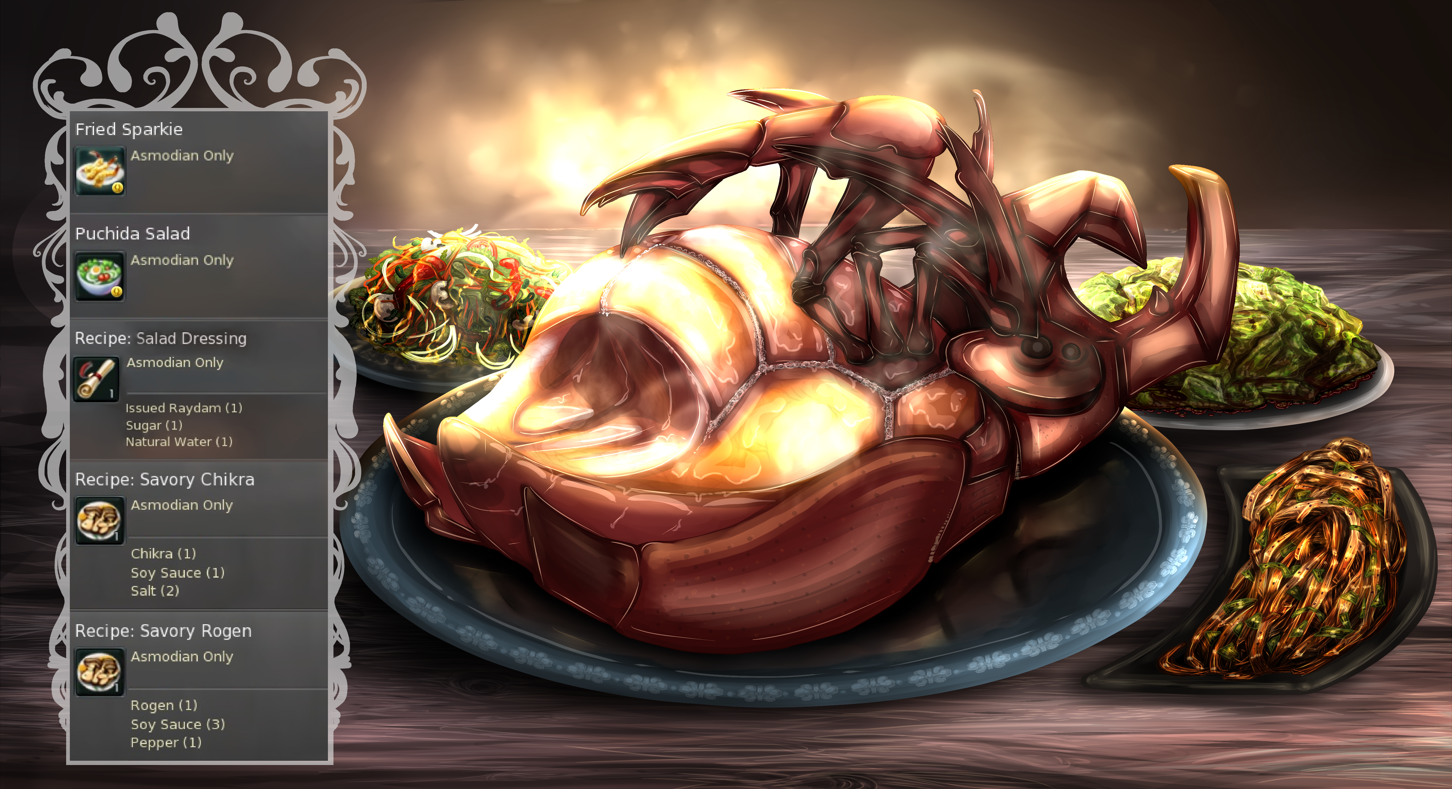 ------OG Published: Feb 16, 2023 / MMORPG Aion published by NCsoft ------ 🙥 Fried Sparkie with side dishes 🙧 The Sparkie is one of the bigger bugs and found throughout many parts of Atreia. Like its bigger cousin the sparkle, it emits light a bright yellow, green or blue light due to the luciferin pouches located on its rear. Both kinds of this big Arthropods, come in many variends, always well adjusted to their environments and highly symbiotic. Only half the size of the Sparkle, the Sparkie is mostly found airborne, but more often than not, found in the presents of the bigger Sparkle, that they were once to believed to be of the same kind, only with extreme sexual dimorphism, with the Sparike being the male and the the Sparkle the female representative of the species. This false belief is only upheld by those never handling or using these bugs for its many uses. The luciferin is widely used as a light source and the slimy sap of the Sparkie can be used in making detergents by mixing it with herbal powder. The eggs can be harvested from both species and burst in your mouth when bitten. Freshly served they are considered the caviar of the commoner.Thought to be a poor class food, the Sparkie made its appearance in even the noble establishments of the main city. With only its luciferin pouches removed, the whole bug then will be fried and presented as a juicy, rustic dish, mostly served with soy sauce and vegetable centered side dishes. Puchida Salad - an easy, rather random salad of all available vegetables. Different leaf vegetables and cabbage types, onions, root vegetables, bell pepper, tomatoes, and even mushrooms. Even eggs can be added. When not served dry, the go to dressing is made from issued Raydam, sugar and natural water. Chikra, a very versatile plant, found in Morheim and prefers temperate and warm, sandy ground. It doesn't need much water and is salt tolerant. Harvested and used for its cabbage like properties, it makes a very easy dish when sliced and stir fried with soy sauce. Found in Morheim as well as Beluslan, the hardy Rogen can be used for its young grains, as well as its leaves and bulb, which has a very mild, watered down, onion like taste. Stir fried with soy sauce, the whole plant makes for a very easy side dish. ------ Drawn with Paint Tool Sai / Wacom Intuos pro M PTH 651 ------0 Comments 0 Shares 24 Views -