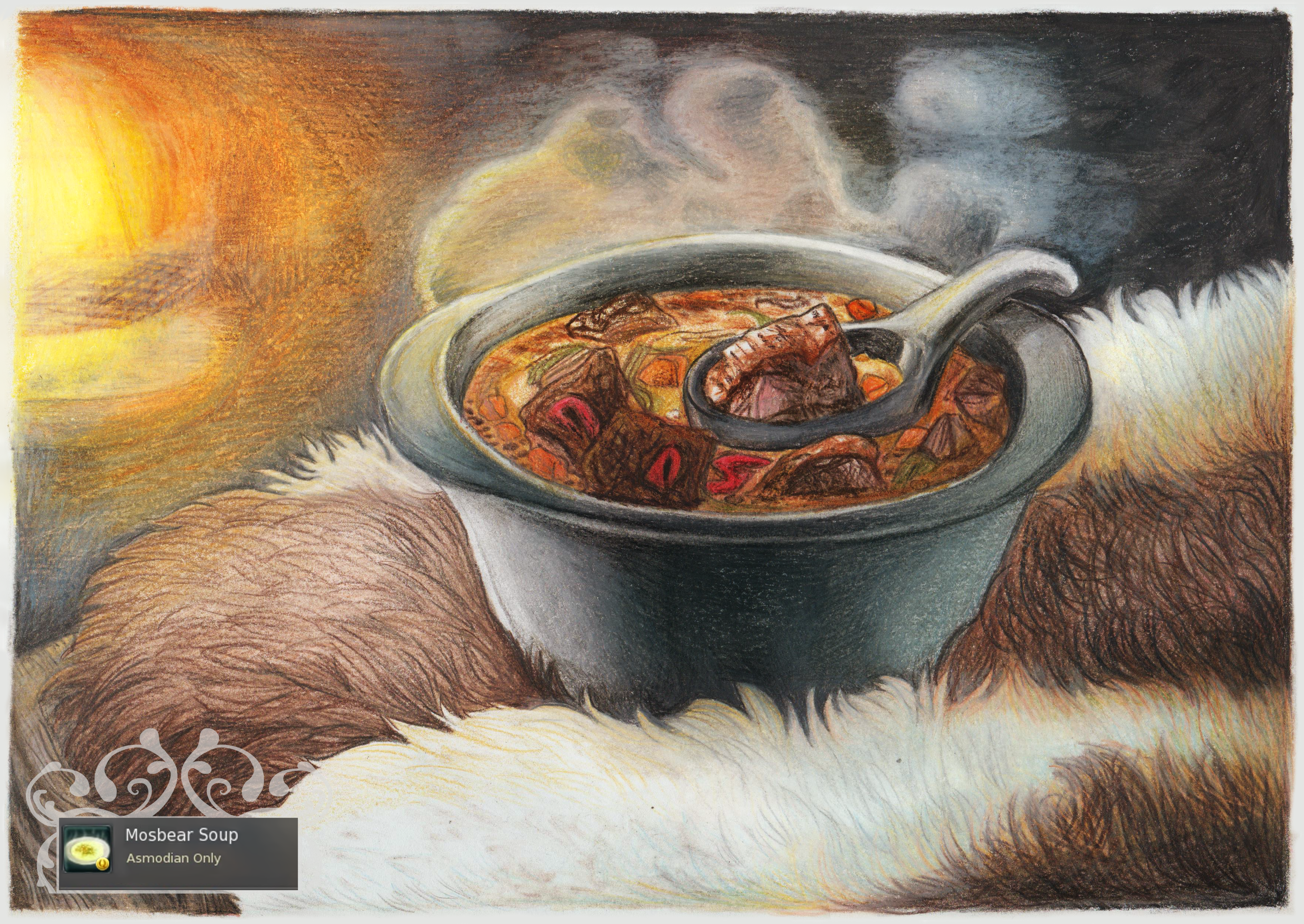 ------OG Published: Mar 27, 2023 / MMORPG Aion published by NCsoft ------ 🙥 Mosbear Soup 🙧 Standing taller than any human or Daeva, the bipedal Mosbear is an impressive and defensive beast. Living in temperate forests and swamps, up to the freezing cold and snowy slopes of Beluslan, they are the apex predators of their domain. Thick skin and make their muscular bodies quite hard to pierce. Their pelts grow especially dense and in some species quite bristly around their neck and shoulder area. In cubs this still outgrowing fur stands up like a mohawk. Some Mosbear types grow large tusks, while all of them, no matter their sex, possess one or two sets of horns reaching adulthood. Despite their feral and fierce appearance, that might suggest a rather simple mind, Mosbears are said to be intelligent, when not hunger driven. One mosbear in particular is reported for even fighting alongside Daeva, to get rid of invading Balaur, suggesting this individual also being a few hundred years old. Beside tales and legends, Mosbears serve a quite down to earth use for humans. Skin and hide make for durable, protective and insulating clothing, as well as carpets and tents. While heads can be fabricated into caps and trophies favored by hunters.Tusks and horns find their use in accessories and decoration. Their slightly sweet meat is rich in vitamins, iron and proteins, though knowing how to prepare and cook it is essential, to not only end up with a tender, but also free from parasites meal. In parts with a dense population of Mosbears, they can even become the main source for a nutritious food source. In fact their meat is so valuable that it will be prepared in the main cities' taverns. There their soup, or rather stew is on their every day manu. For this their roasted bones and aromatics such as seasonal root- and bulb vegetables are simmered with seasoning for one night's stay, before deglazed with Kirka whine to create a rich broth. The bear's meat is then seared up and browned, salted and peppered, before also declared with whine, joining the broth in its pot for three to four additional hours. Ready is a hearty, tonic soup, satisfying guests, customers, humans and Daeva alike! ------ Drawn on paper and colored pencils / Traditional / Recipe done in Paint Tool Sai ------0 Comments 0 Shares 27 Views -