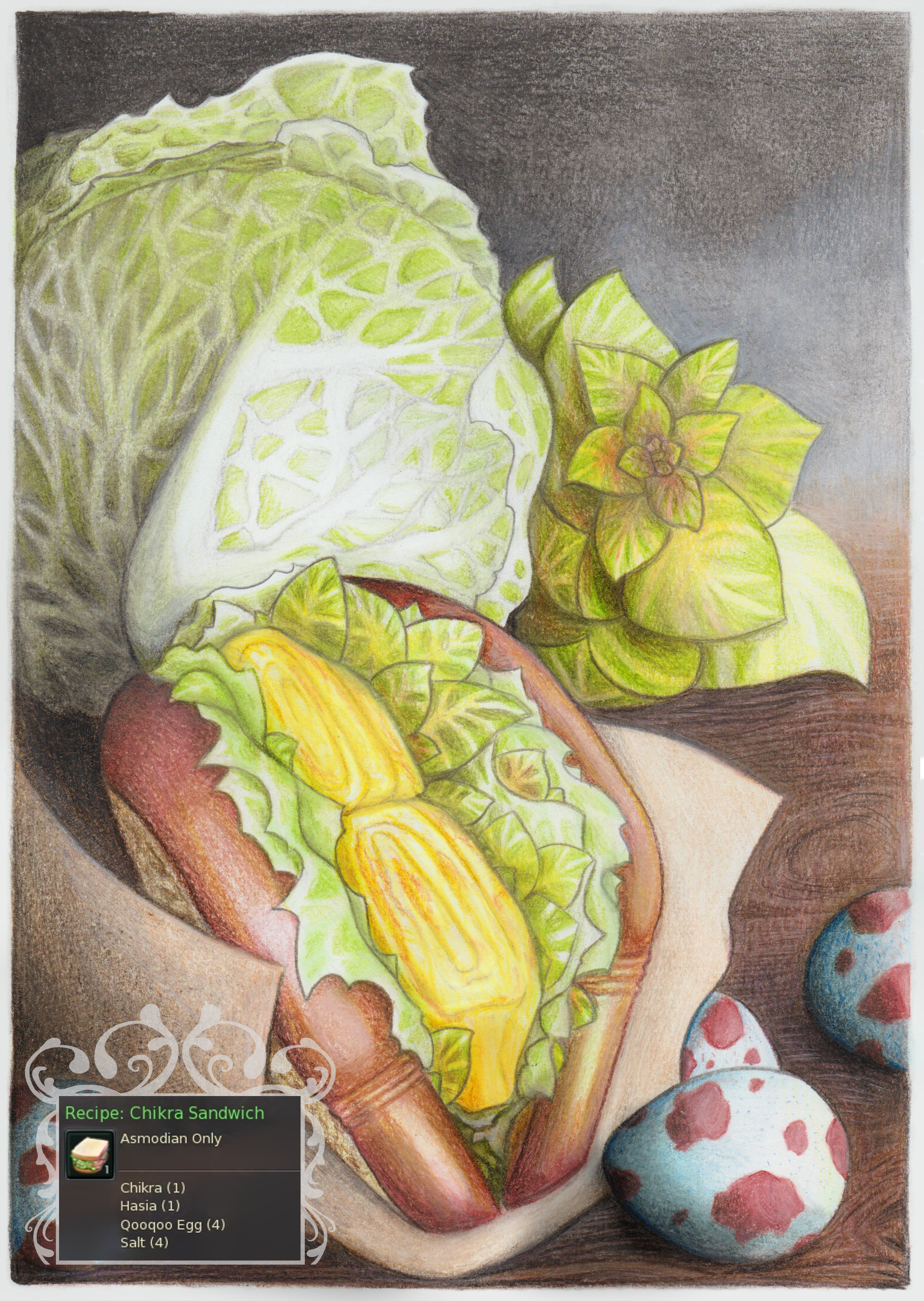 ------OG Published: Apr 7, 2023 / MMORPG Aion published by NCsoft ------ 🙥 Chikra Sandwich 🙧 Using a soft, mild and tender bread, made by scaling a portion of the flour in a recipe with boiling water. This method gelatinizes the starch, making the crumb of the bread soft and airy, so it stays not only softer for longer, but the loaf gains a nicely baked ‘skin’ instead of a crust. The dough is also left to rise at a low temperature for a long time, before a long steaming process, which gives it its moist and mellow texture. Before using it as the base of the sandwich, it is recommended to toast the slices of bread, giving it a crisp surface. Next up is the Chikra. A very versatile plant, found in Morheim and prefers temperate and warm, sandy ground. It doesn't need much water and is salt tolerant. Harvested and used for its cabbage like properties, it also makes for nice raw use. Clean and cut one big leaf as a first layer. The next layer will be that of Hasia leaves. Hasia is a fresh herbal plant, mostly used in the field of alchemy and if rumors are true, even for making secret remedies. It too shares traides with the former mentioned Chikra, though its distribution is at the Salintus Desert. Known for the huge, bulbous, succulent stem it shares with other members of its herbal family, this plant's water reserve is easy to spot at deserts grounds. Now to our four Qooqoo eggs. Cracked and whisked in a bowl with some salt, they then will be fried without any further disturbance, other than folding it . Bit by bit, the rest of the mixture will be added, creating a rolled omelet. For a final touch, the folded omelet sides will be fried, while also pressing it into shape. Let it cool for about 5 minutes, to achieve a nice clean cut.It will make for the centerpiece of the Sandwich, which means next up is again a layer of Hasian and then Chikra. A nice, refreshing herbal Sandwich, not too heavy, even though its omelets center. ------ Drawn on paper and colored pencils / Traditional / Recipe done in Paint Tool Sai ------0 Comments 0 Shares 25 Views -