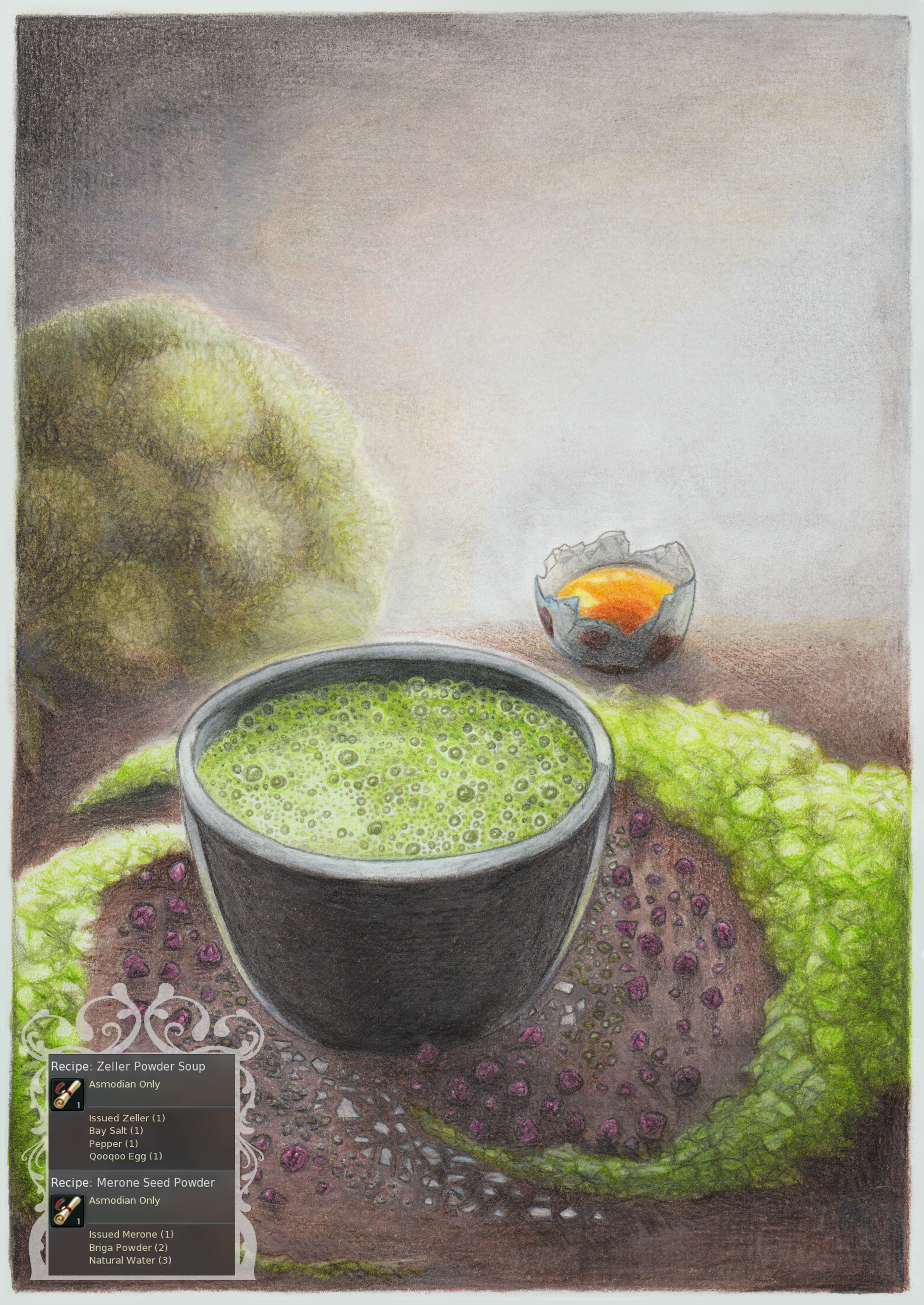 ------OG Published: Apr 10, 2023 / MMORPG Aion published by NCsoft ------ 🙥 Zeller Powder Soup with Merone Seed Powder🙧 Native to Morheim, Beluslan and Brusthonin, Zeller is also one of those plants, forming big bulbs as storage, but compared to Briga, Horto or Krimer, it's not edible. Instead, it's the stem and young flowers that will be used in different dishes or cooked and mashed for further use. One of these can be drying and grinding it into powder or flour. For this, the plant parts will be separated and sliced, before dried until brittly. Pestled and stored in glasses or clay pots,it is not only saved from spoiling easily, but also very versatile. One of those used is to mix the powder with salt, pepper and eggs, before the paste is brewed with hot water, bit by bit while firmly stirred. The result should be a foamy, smooth soup without splitting the egg in bigger chunks. An easy to make, mineral and vitamin rich soup, especially outside the harvest times. More an upper class touch of such simple food, requires Merone seeds. Savory, nutty, with a delicate earthy note to them, the greenish dried seeds of the fruit will be crushed and added to a blend of Briga powder and water. Heated and stirred, the covered seeds are roasted, developing their full aroma and make for a great topping, inspiring the minds of food artists alike, into combining the lush greenery with its earthy roots. ------ Drawn on paper and colored pencils / Traditional / Recipe done in Paint Tool Sai ------0 Comments 0 Shares 24 Views -