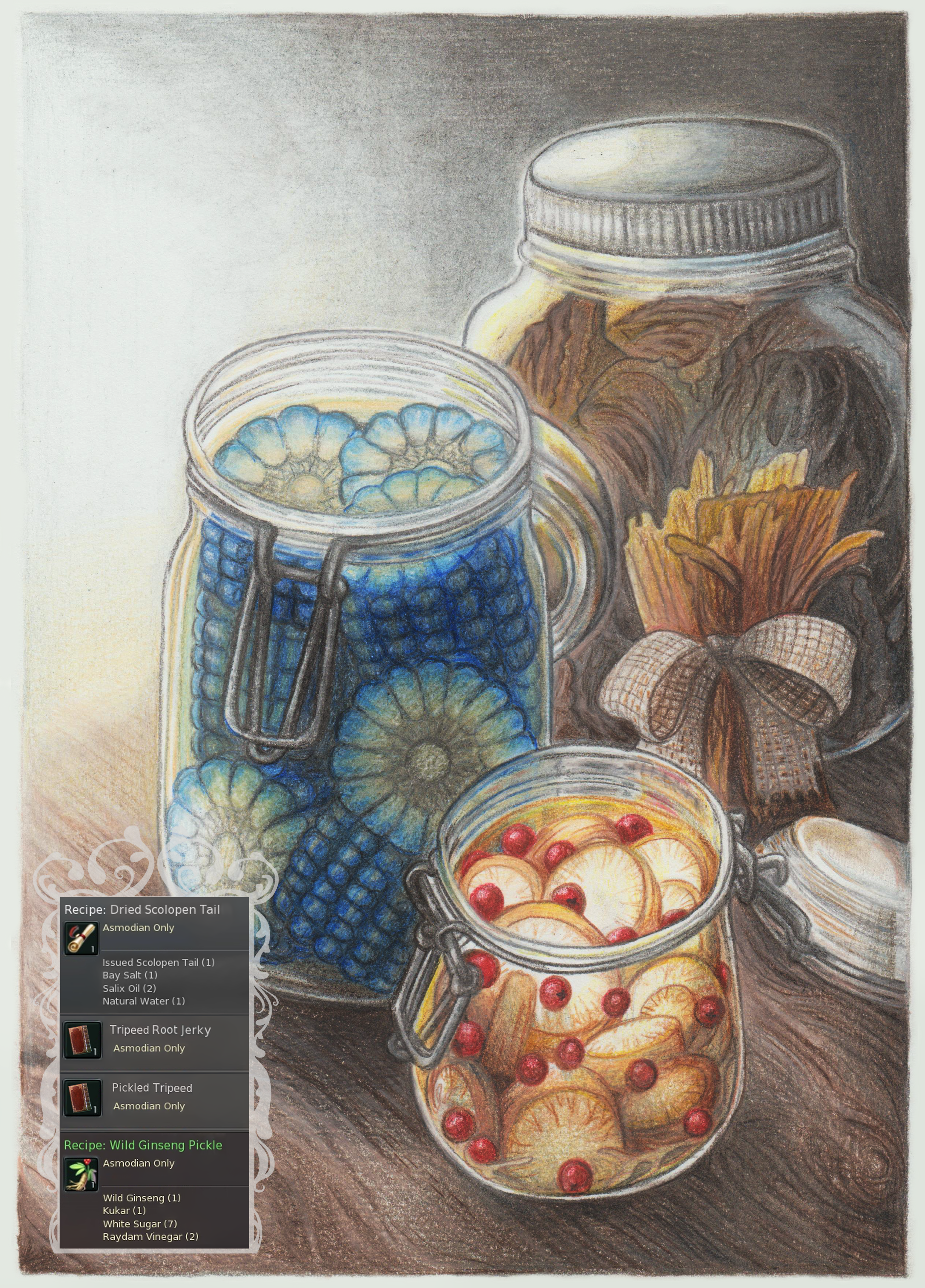 ------OG Published: Apr 14, 2023 / MMORPG Aion published by NCsoft ------ 🙥 Pickled and Dried Goods 🙧 Key to a sustainable food source are dried, canned and pickled goods, as cubes are hard to come by as well as pricey. This is especially important for the common Asmodian, scattered about, making a living under given conditions. On this page, we take a closer look at four of these. Dried Scolopen Tail. Scolopen are predatory invertebrates, possessing six legs, a pair of grasping pincers and a narrow, segmented tail. Carried with a raised abdomen and in a characteristic forward curve over the back, the stinger is well presented at the tails end, as well as one at the Scolopens back end. With a shake of its body, Scolopen communicate with their conspecifics as well as predators. Its closest relative lives on Elysian grounds, called Scorpin. Asmodians profit from the Scolopens potent poison, as well as the fleshy tail. Dried, cut and put in a canning jar with two parts oil, one part water and salt, it stays preserved for further use. Tripeed root jerky Again we take another peek in the book ‘Wonderful Tripeeds - 1001 things we can make from Tripeeds’. Remove the outer layer of a washed root, before continuing with cutting it into thin layered stripes. Trim, before dehydrating with salt to prevent spoiling by fungal or bacterial growth. The taste is of a mild earthy, umami nature, with a sweet endnote. Pickled Tripeed A great recipe for preserving fresh Tripeed, making the best out of every harvest. But be sure to use only the freshest cobs. Husked, cleaned and quartered,they are placed in a large bowl with salt and enough water to cover. In a stock pot, mix vinegar, sugar, pickling spice and herbs, before bringing it to a boil over medium heat and make sure the sugar dissolves. Drain and rinse cobs under cold water and add to the pot with the pickling mixture. Return to a boil, reduce the heat to low, simmering for ten minutes. Remove the Tripeed cobs from the pot and place in the sterile jars before adding the vinegar mixture within a claw thick of the top. The cobs should be completely covered. Now seal the jars with hot water - done! Wild Ginseng Pickle As Ginseng is hard to come by, wild Ginseng is a real treasure to find and therefore should be treated and preserved as such! Cleaned they will be shortly cooked and put into a ice bath, before slicing. Vinegar and white sugar will be brought to a boil, before reduced to a simmer. Place the Ginseng, with fresh, cleaned Kukra berries, before proceeding the same process as the former recipe. ------ Drawn on paper and colored pencils / Traditional / Recipe done in Paint Tool Sai ------0 Comments 0 Shares 31 Views -