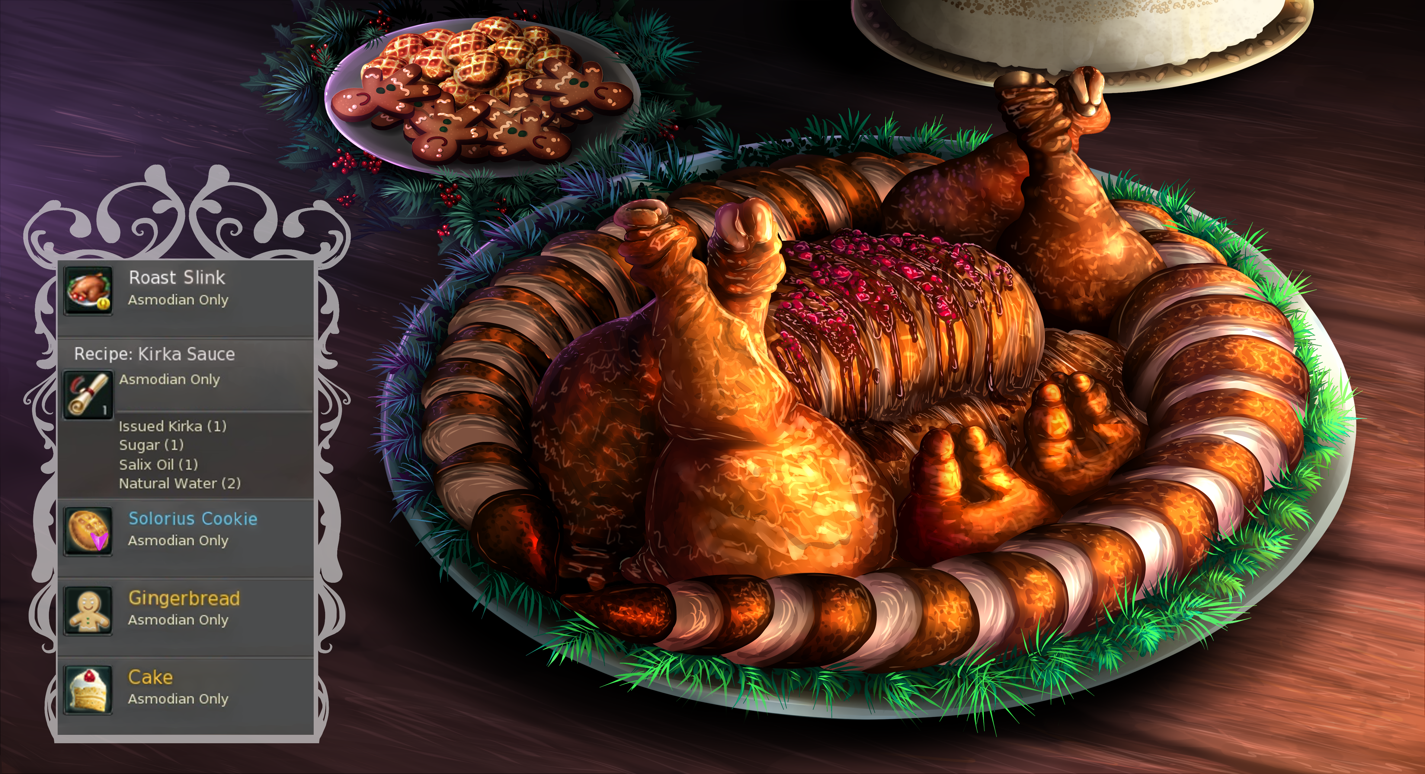 ------Published: Dec 24, 2023 / MMORPG Aion published by NCsoft ------ 🙥 Roast Slink with side dishes 🙧 The Solorius Festival is a monumental celebration to honor the previous year's ascended Daevas and their service to humanity. It is not only one of the year's most anticipated events, but also one of the oldest. Its origin dates back to before the Cataclysm. It is a festival of communion, sharing, and appreciation. Wealth and status are set aside each year as families make diligent preparations in advance to honor the ascended. Many Atreians make their travel to their capital citys to immerse themselves in the festivities. One of such is to get a good share of the seasonal foods as gingerbread, filled cookies and pay a visit to the world-renowned bakers of Sanctum and Pandaemonium with their impressive cakes whose recipes are kept secret throughout all this time. Though for many Asmodians, where travel is unthinkable, more humble solutions will do, saving up for this very season and for their families and community to enjoy self baked goods and big portions. One of such, is Roast Slink, optional varnished with Kikra Sauce to compliment the season. For this, freshly hunted Slink will be firmly cleaned, before braised with hot water, so the outer film of moist skin can be easily shed. Roasted whole over an open fire, till reaching the desired color of a good roast, the head will be cut off and used together with the bone and cartilage used for purposes. The skin will be plated, same as the finer shredded meat parts, followed by the forged tail tips, legs, rib and prime back meat. Delicious with its mild flavor and a texture most similar to Qooqoo wings. The taste and texture of Slink meat is approximately between Qooqoo and fish, most similar to catfish like Pujery. It also doesn't turn out rubbery, as Monitor can turn out, if prepared poorly. The succulent, juicy meat works great on its own, but as a season special, Kira Sauce is a really nice compliment, by color and its not too sweet or tart. Easily cooked with same Kikra fruit, sugar, salix oil and two parts of water, its a true delight. Happy Solorius to everyone! ------ Drawn with Paint Tool Sai / Wacom Intuos pro M PTH 651 ------0 Comments 0 Shares 42 ViewsPlease log in to like, share and comment! -