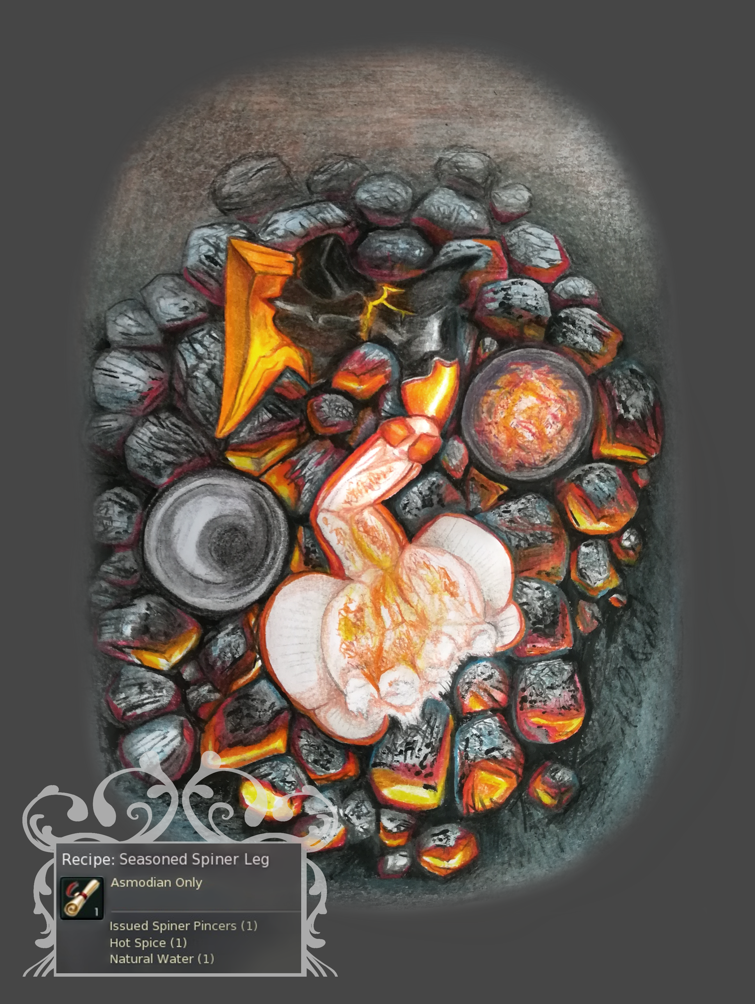 ------OG Published: Aug 30, 2022 / MMORPG Aion published by NCsoft ------ 🙥 Seasoned Spiner Leg 🙧 The spiner is creature found in both Asmodae and Elysea. Looking like a more terrifying version of a giant, heavily armored and aggressive lobster. The asmodian species is found in the burning hot lava regions of Musphel Gate and Mt. Musphel in Morheim. The most striking one, is the Obsidian Spiner. It’s protective skin plates, called spiner stones even took the look of lava, while fully grown individuals stand out from their surroundings, by their metal black base, making its orange markings even more present. The name spiner stone, might be misleading, but stems from some people mistake it for a stone due to its solid, stone-like appearance. Tho the true gem, is it's dangerous, ax shaped, sharp pincers. The sweet, mild, but rich crabby flavor and pleasant muscle texture make it a sort after delicacy that even fancy Eloys might not miss out on. Prepared and steamed with water on lava stones or glowing embers, the lighter parts of the legs, will turn into a nice orange red due to the process known by crustaceans. If the spiner, besides looks, taste and properties can be counted into this family, is unknown and might be up for debate. However, the legs will eventually break open, revealing its juicy treasure and can then be seasoned. Fitting to it’s nature, the most commonly used is a hot spice mix. A feast for more than just one person and too tasty to not share. Enjoy a regional luxury of Morheim! ------ Drawn on paper and colored pencils / Traditional / Frame and recipe done in Paint Tool Sai ------0 Comments 0 Shares 31 Views -