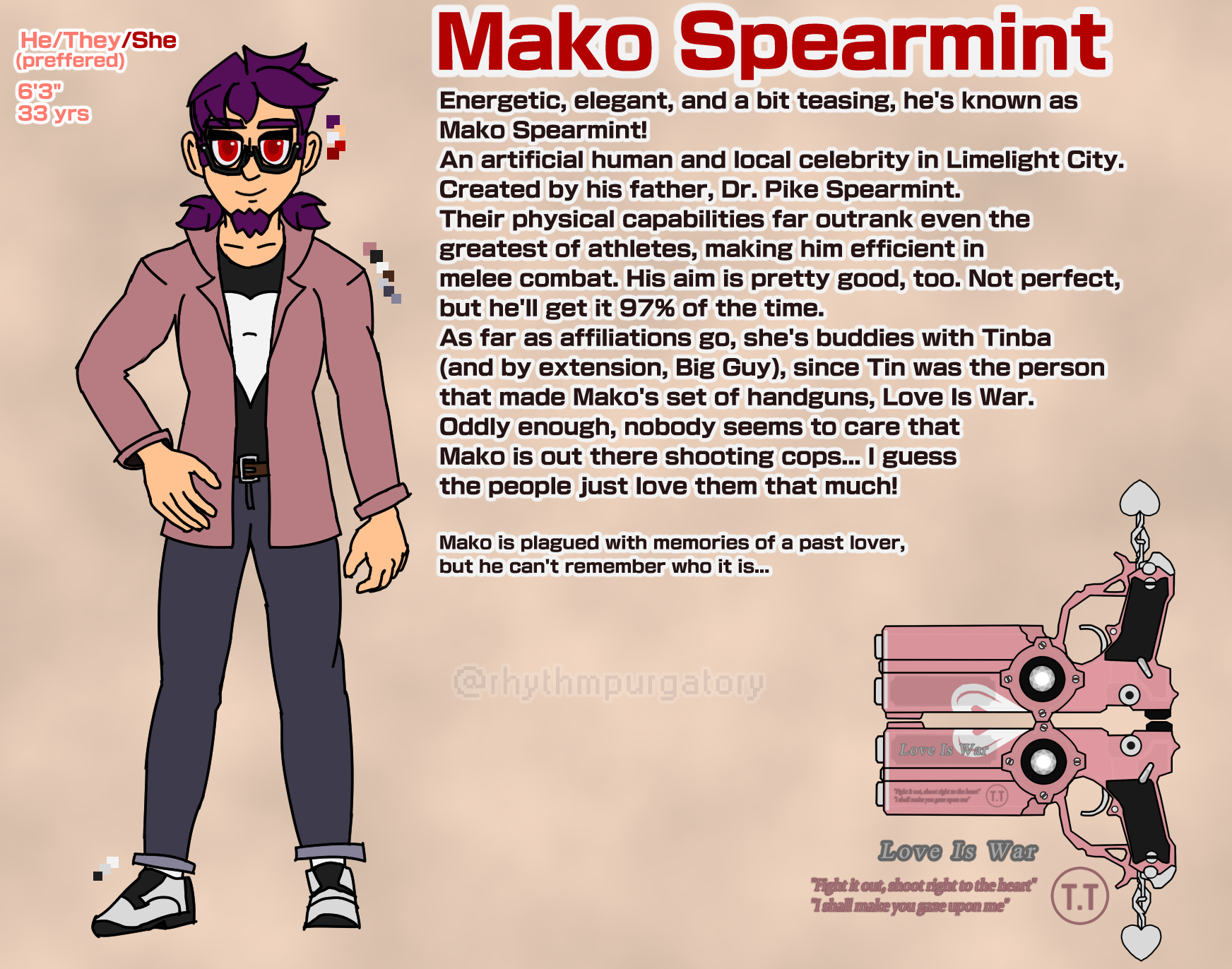 also there's some gay stuff going on with him and the dj on the moon BUT THAT'S FOR LATER.Mako (full name Mako Spearmint) is an artifically created Brawler who lives in an apartment in uptown Knockout City. His creator/father Dr. Spearmint created him to be the Ultimate Brawler! And not to make him sound like a "Mary Sue", but his physical capabilities are much higher than that of any other. However, due to having complete control over their life starting from his creation, she picked up many other hobbies completely unrelated to Dodgebrawling. I guess you could say he's a bit of a local celebrity in Knockout City, having modeled for advertisement photos and even singing his favorite songs at music festivals! Speaking of their singing, her voice is something else! It has the power to completely influence the crowd (and backup performers) with whatever the song's mood is! A happy, energetic tune will get everyone riled up and ready to party~! A sad, somber melody could end with everyone in tears!! And with his special-made Holo-Mic, he can boost the music enough to hijack the radio!! also there's some gay stuff going on with him and the dj on the moon BUT THAT'S FOR LATER.0 Comments 0 Shares 6 Views -