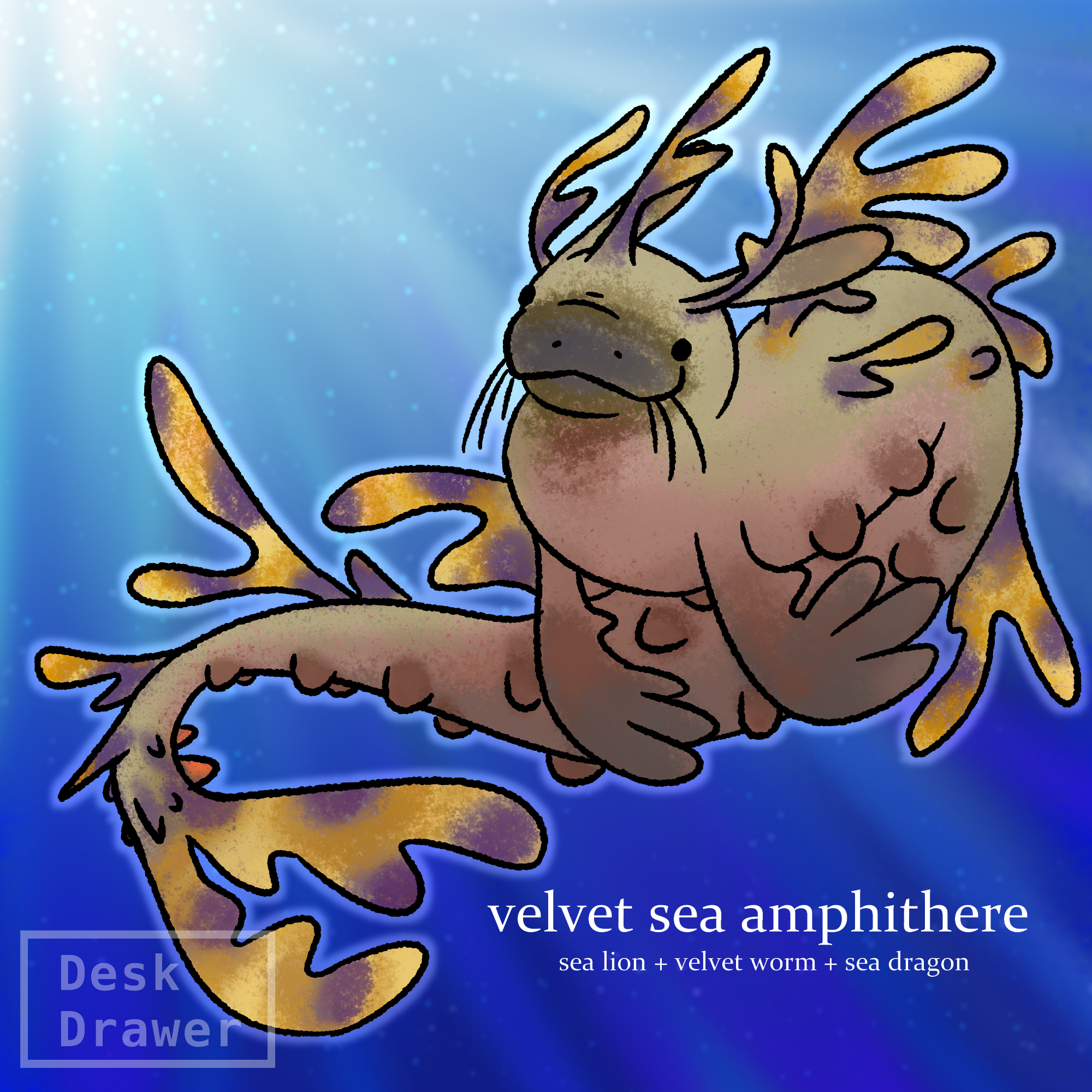 a weird frankenstein between a sea lion, a disco seahorse, & a wormy thing.