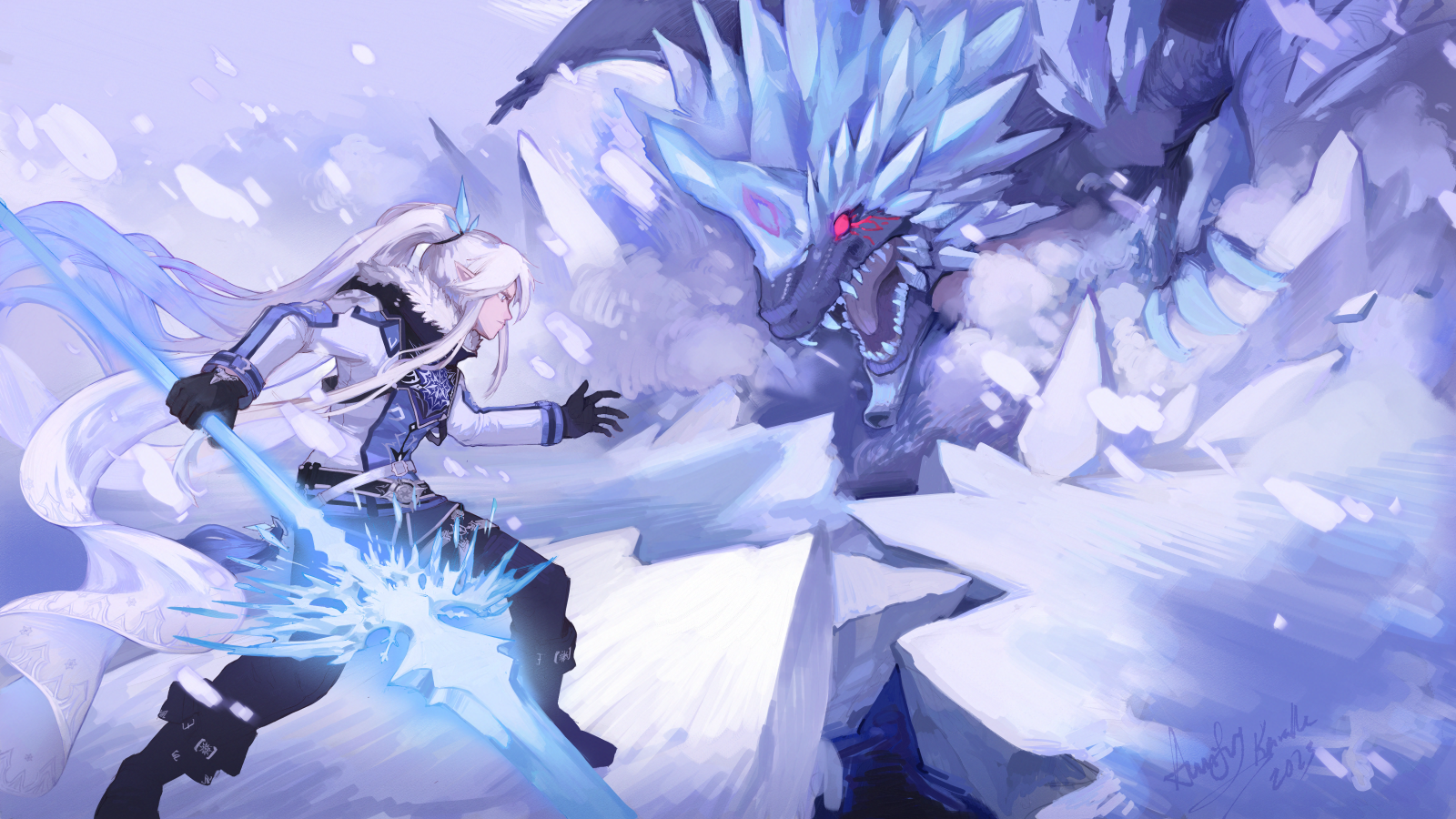 Let's mark this first new post as a new beginning, with fan art of my favorite game! This is Glacial Master (NEO), fending against the Ice Dragon Skasa during the Machine Revolution era.
