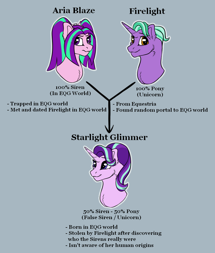 More on this coming soon...When Firelight was a little younger, he loved exploring around the local area of his home village, Sire’s Hollow. One day, he stumbled upon one of the hidden portals to the EQG human world. Loving the thrill of finding such a huge discovery, he kept it his little secret place to runaway to. One day, he met Aria. He found her interesting, and she... well, was bored. They started dating, and one thing led to another, with Aria getting pregnant. Firelight stayed in contact as best as anyone hopping between two worlds could, but one day, he couldn’t find the Dazzlings. Turned out, they moved home to get him off their trail. By the time he found them a couple months later, their baby had been born. Unaware of Firelight’s snooping, the Dazzlings didn’t hide what they were talking about. Upon hearing about who they truly were, he knew it wasn’t good news. Fearing his daughter’s safety, he kidnapped her, taking her back to Equestria through the portal he was thankful he never told anyone about. He raised Starlight believing her mother left when she was a newborn. Starlight bought it, but still found it odd how no one in Sire’s Hollow actually knew who her mother was. But secrets come bubbling to the surface eventually... My headcanon is that ALL Sirens are born female. The way they give birth to more Pure Sirens is by enchanting a Pony (male or female), and using their magic, make them the other parent without them knowing. However, they MUST be in their normal Siren form for this to work. If they are in their default Earth Pony disguise, or in this case, in a world where they can’t access their normal Siren form (EQG), they will fail to produce a Pure Siren. They will instead produce a “False Siren”. The characteristics of one are as follows: - Always their pony parent’s tribe without fail - Can't access to Siren magic - Their abilities/magic are boosted in power - Can't pass on their power to their foals, stopping the “Siren bloodline” More on this coming soon...0 Comments 0 Shares 23 Views -