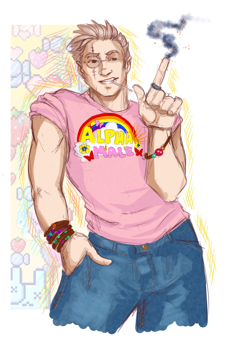 Someone on PaperDemon discord found this shirt and it was just SO FAR from Trigger's usual Kaboom shirt I had to draw him in it. NGL it was a LOT of fun to pull him out of his 'I'm edgy and hiding' colors and themes and makes me wonder if he'd have been much more colorful if elements of his backstory were different, or what it would look like if he could decorate someplace he felt totally safe.