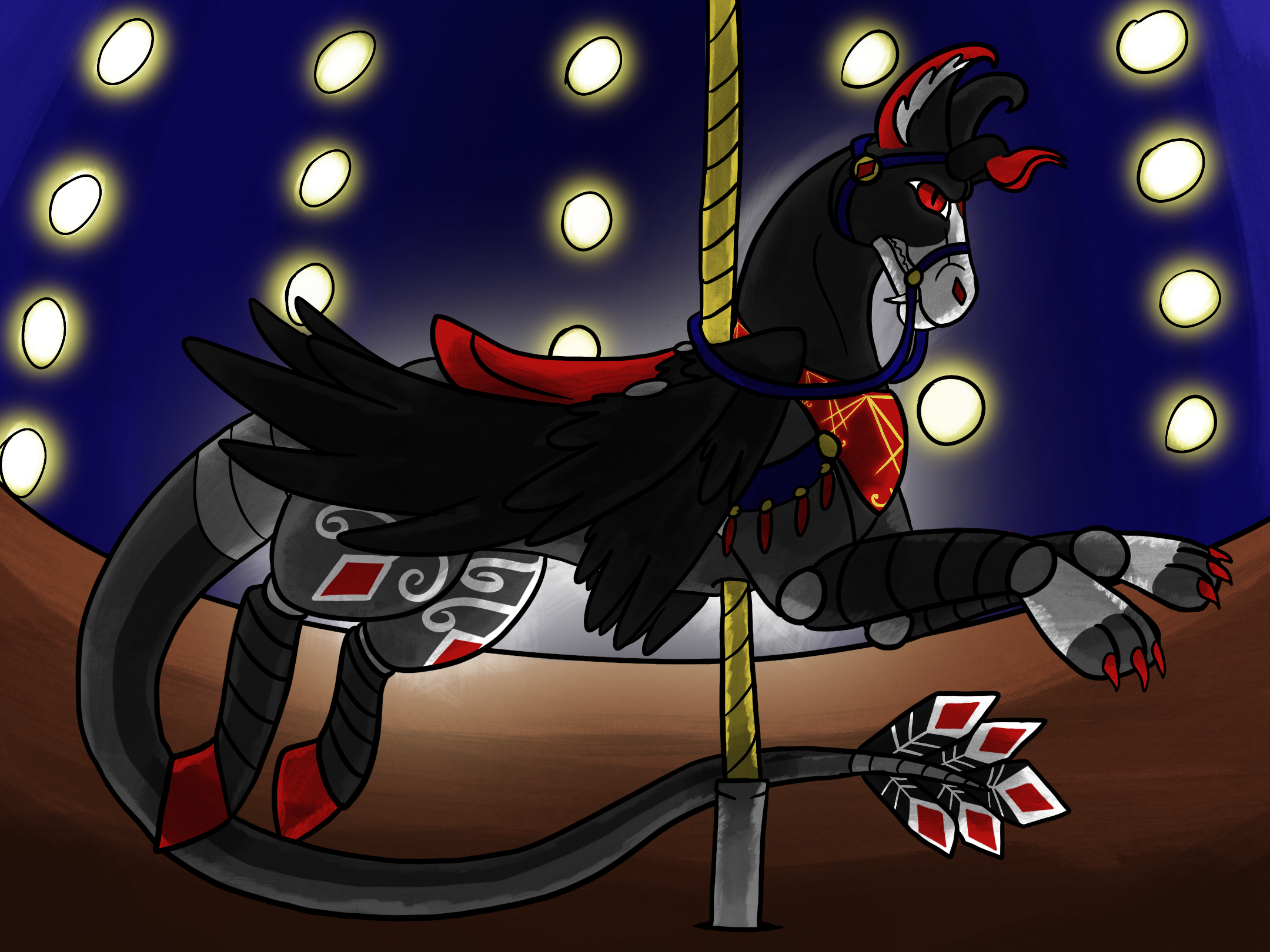 “You approach the lone carousel horse, a shiver down your spine as you catch the glint in its eye, perhaps a trick of the bright blaring lights around you. You hop on it’s back and it starts up with a sickening clunk, it begins to move up and down with great struggle, evidence of its age. Between your legs it feels like the horse is breathing. You hear the carousel whisper to you, “would you like to slay God?” —— My Dutch angel dragon character, Morningstar, as a Five Nights at Freddy’s inspired character.