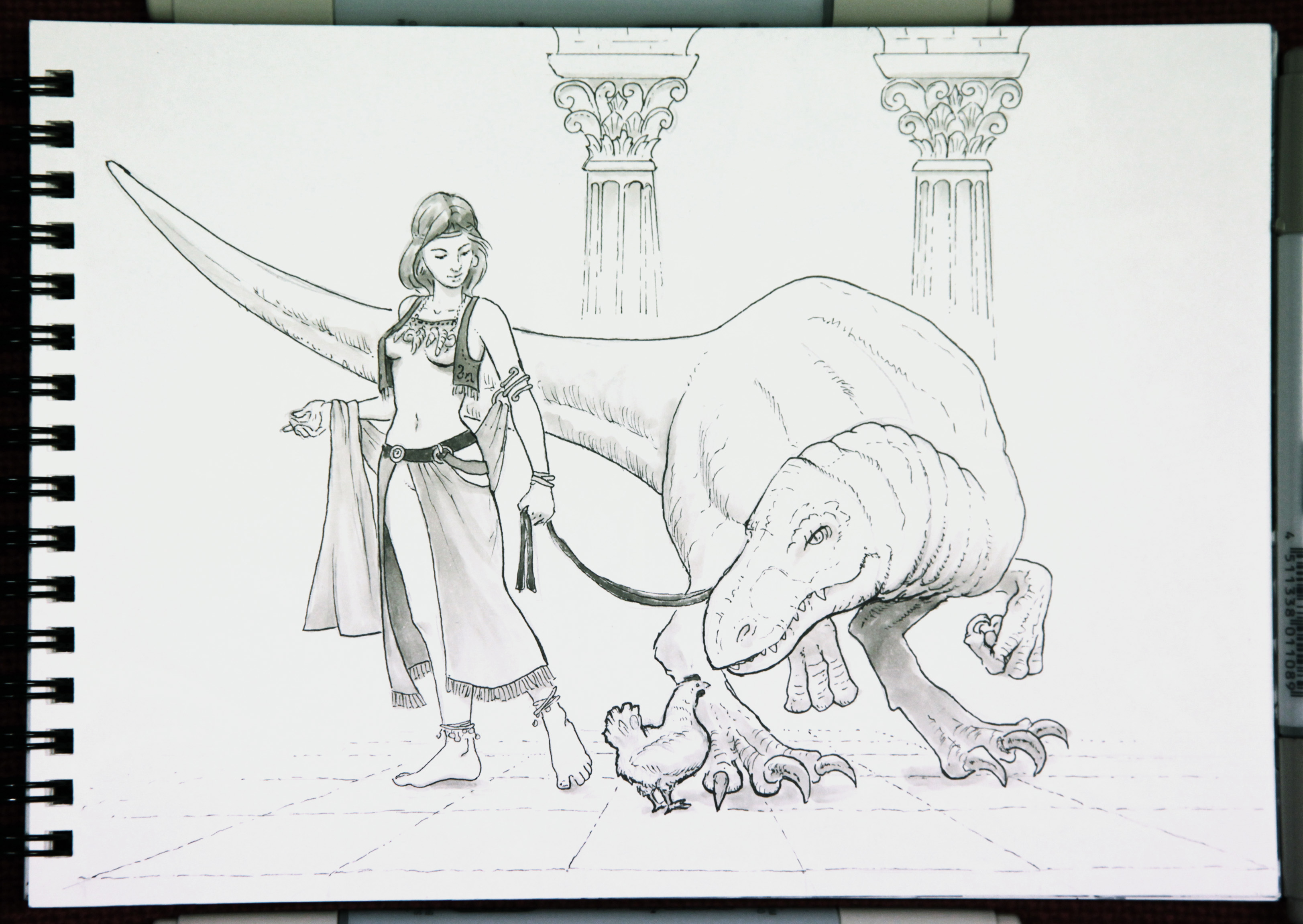 2018 Inktober day 5, prompt word "chicken"... I don't know how this came into my mind. I was thinking about roman thermae and a dinosaur, and of course a beautyful woman... then this idea of "meet your evolution" joke popped up. I find it a funny piece.