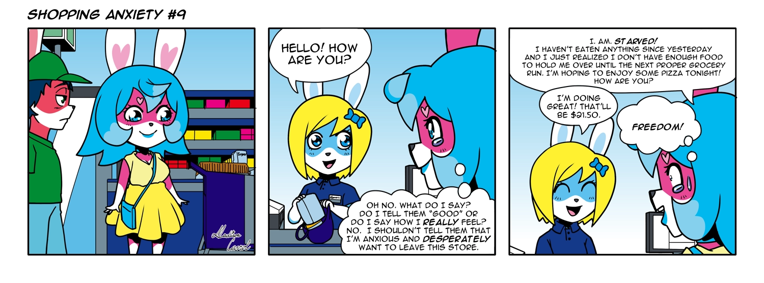 • We've reached the end of this arc. I didn't originally plan on having an arc when I started writing these. I was just gonna do random stuff. But then I started thinking about how there's all these things that happen when I shop that make the experience very unpleasant for me. I could still do other shopping related comics, but they wouldn't fit with this arc and I can always do them later.