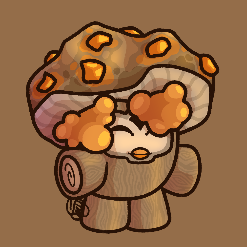 Image Description: A shaded fullbody drawing of Equinox, a sable brown wooden Furby-like character with a mushroom cap that has orange protrusions on it's top, and orange fluffy hair-like fungi underneath. Equinox is looking happy, with it's eyes closed and a warm undertone to all the shading and highlights.