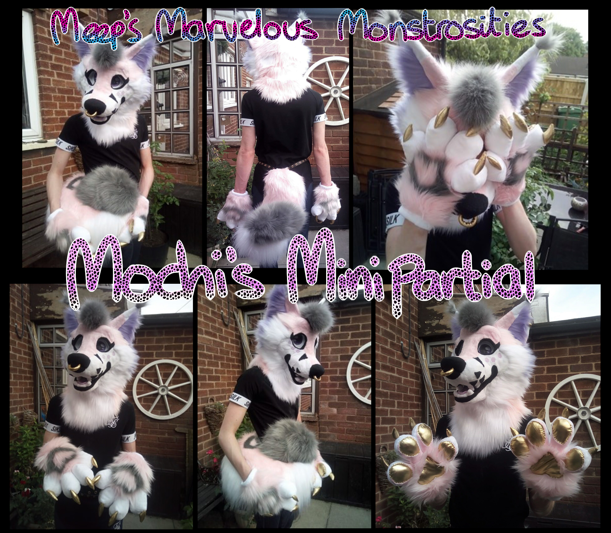 Commission completed 2020 featuring a minky faced fursuit head, medium curl tail and a set of minky finger puffy paws