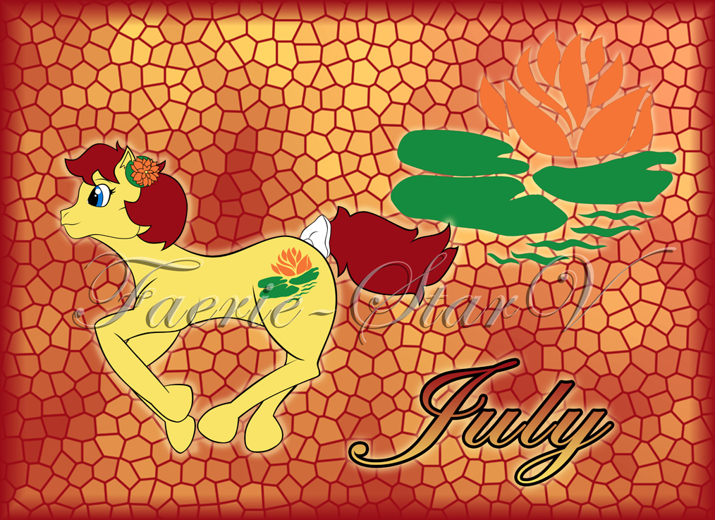• This is Water Lily, an Australian Birthflower pony. http://mylittlewiki.org/wiki/File:July.jpg She actually looks cute as a short-haired red head with a water lily on it. X3