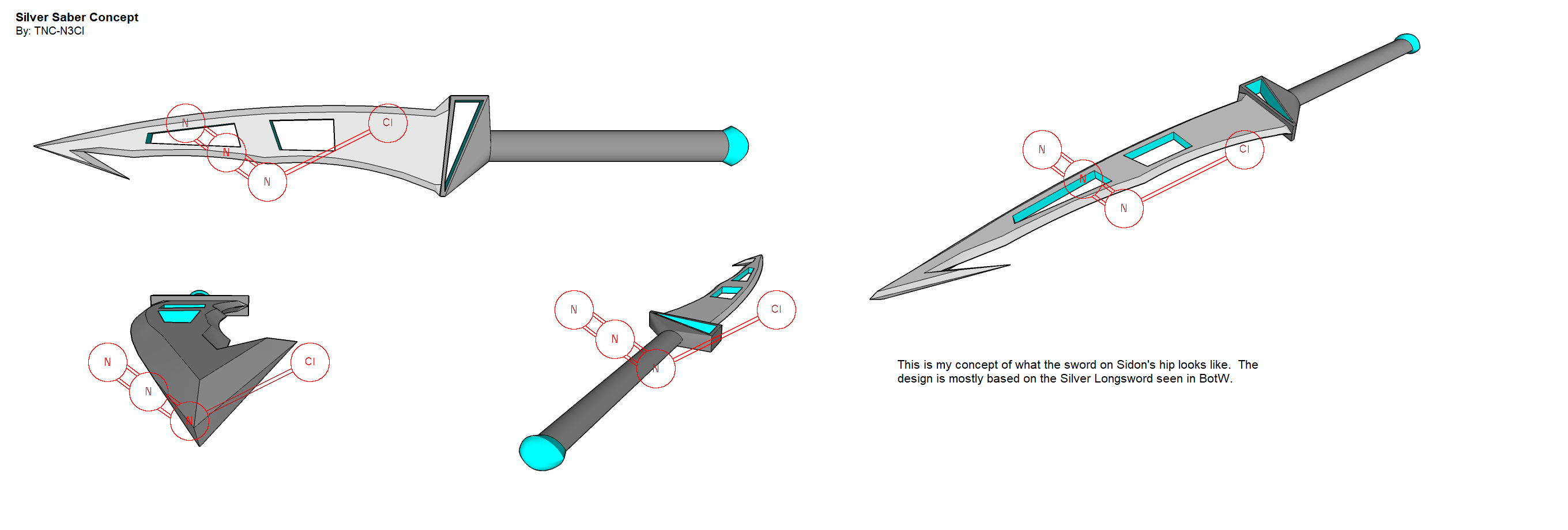 So, this particular blade is my interpretation of the sword Sidon carries on his hip in BotW and AoC, but never uses. I loosely based it on the Silver Longsword featured in those games and called it a saber due to the shape of the scabbard. In universe this is more of a badge of office, but it constructed to be used as a weapon. It will be shown in an upcoming chapter of "The Amnesiac Hero's Quest," and may make an appearance later on in the story of "The Realm Walker." I may try and refine it some later, but for now I'm calling this "finished" since it's basically just a concept idea. That's also why I haven't included any of the usual size reference material that I usually do.
