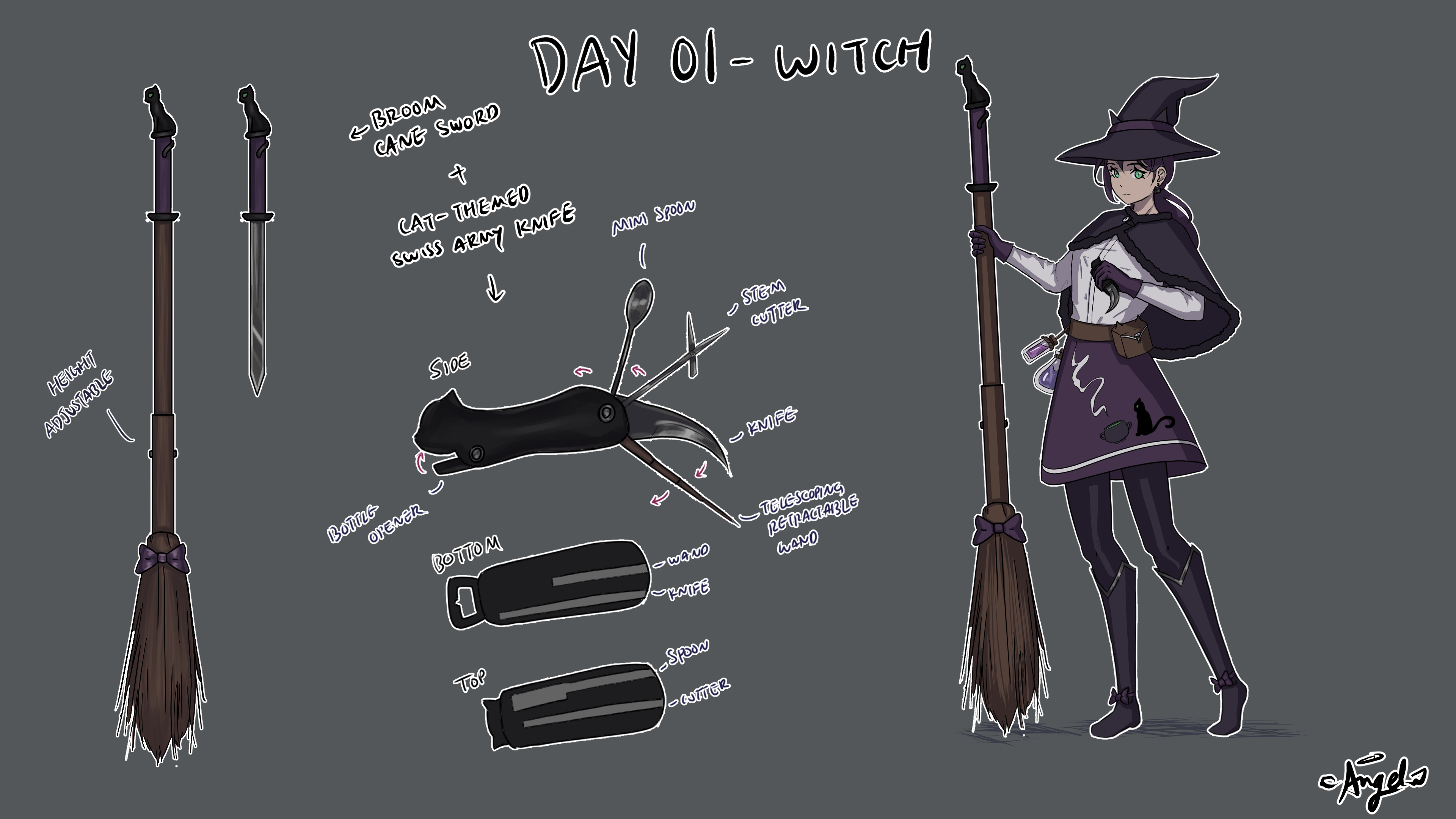 for this prompt, i went for more of an anime witch than a spooky scary witch, focusing on a black cat motif and potion making. her swiss army knife is meant for when she goes to gather ingredients, and has a small spoon and wand for if she also decides to make potions on the go. the broom cane sword probably flies, too. the bottom portion of the broom is height adjustable, in case she needs to bring it somewhere a little more cramped, or for storage! her skirt is also inspired by poodle skirts.doing some of swordtember this year, prompt list is from @faith_schaffer on twitter, who formatted these prompts to accomodate character designs as well as the swords~ i won't do every prompt, but i'm picking a few that i like! for this prompt, i went for more of an anime witch than a spooky scary witch, focusing on a black cat motif and potion making. her swiss army knife is meant for when she goes to gather ingredients, and has a small spoon and wand for if she also decides to make potions on the go. the broom cane sword probably flies, too. the bottom portion of the broom is height adjustable, in case she needs to bring it somewhere a little more cramped, or for storage! her skirt is also inspired by poodle skirts.0 Comments 0 Shares 0 Views -