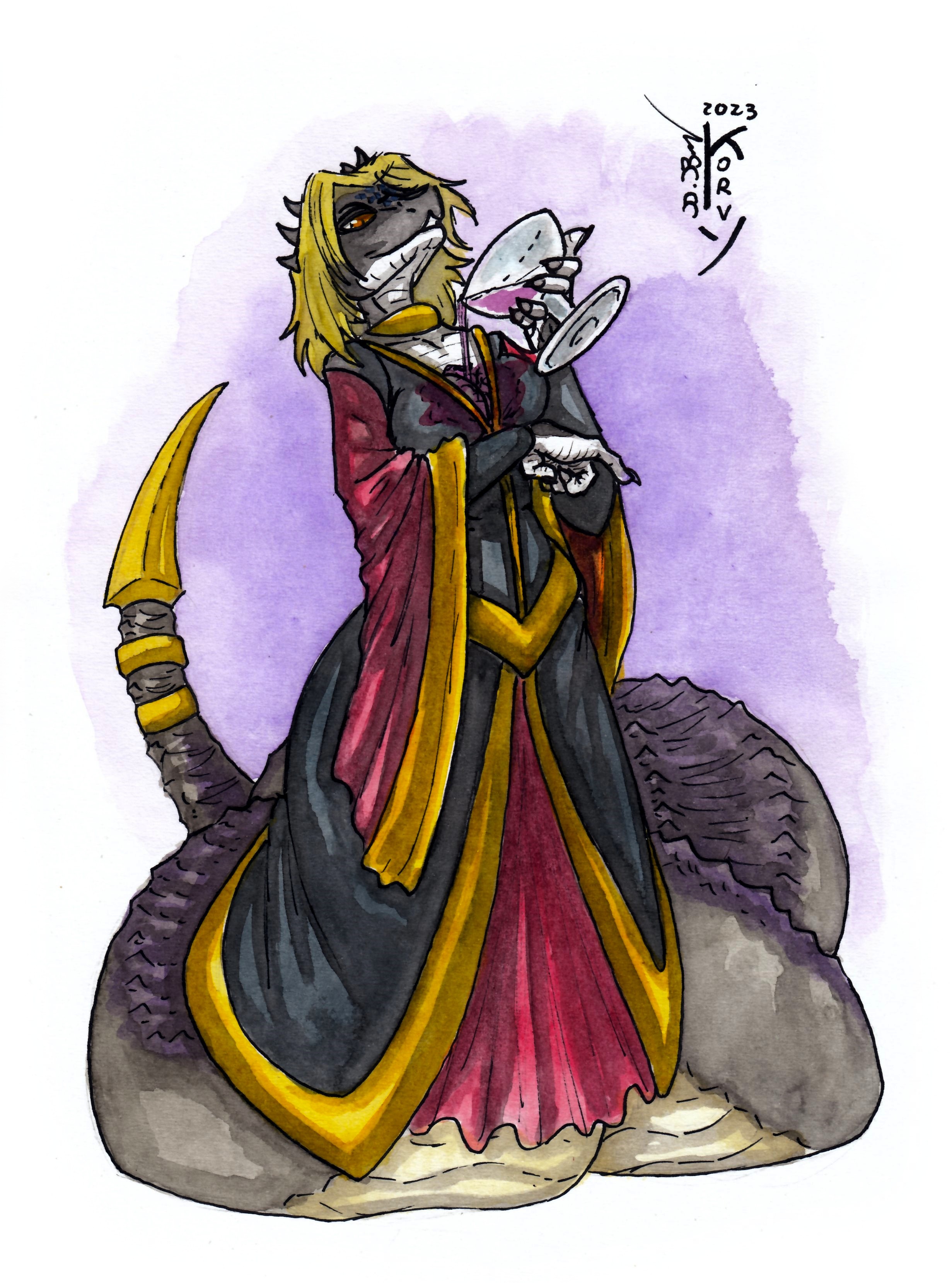 A new commission for my patron Eagle Writer! (koblbird on Twitter) Would you like a little sip in the company of a sultry scaly beauty? šŸ· (Character belongs to him.) - Posted the 9/01/2023 on my Patreon (+ sketch): Patreon.com/Korvy