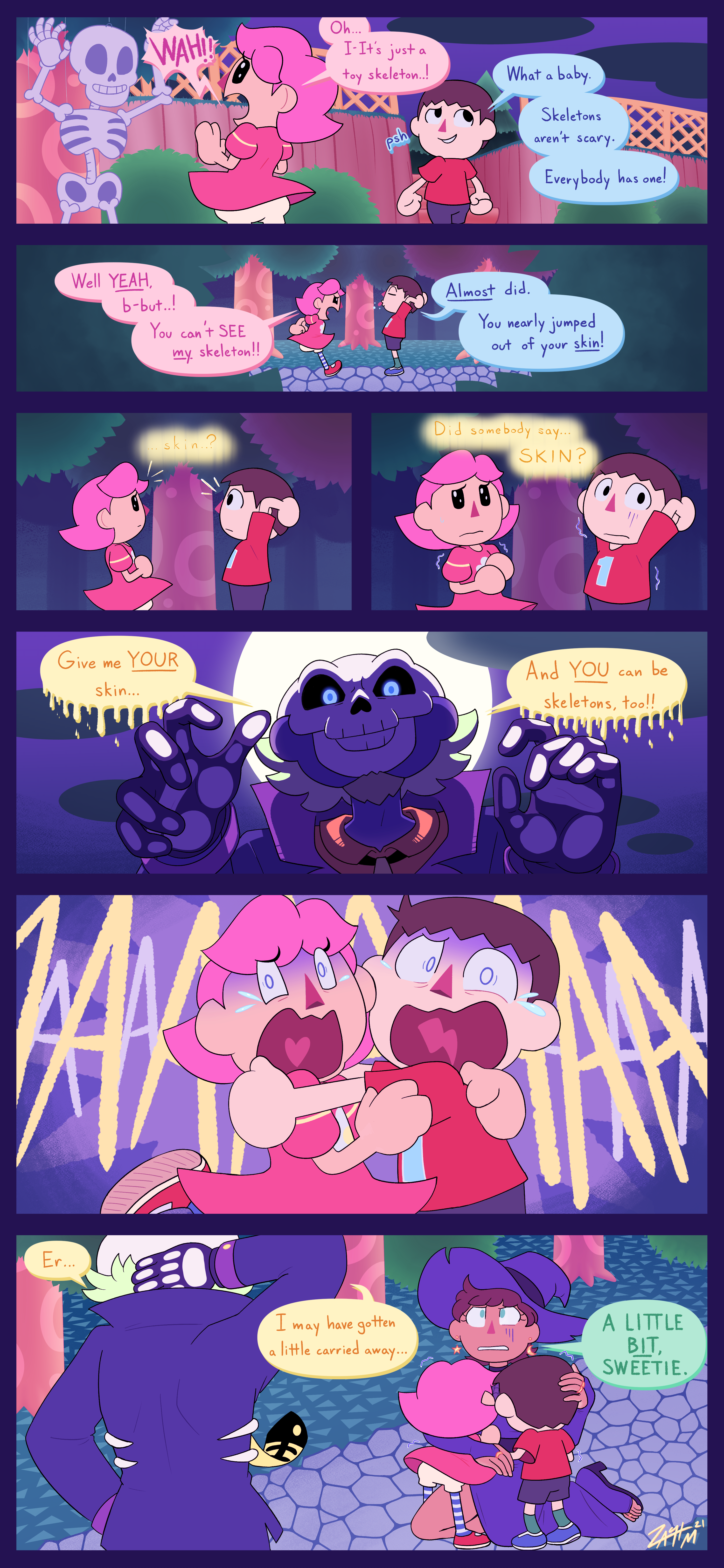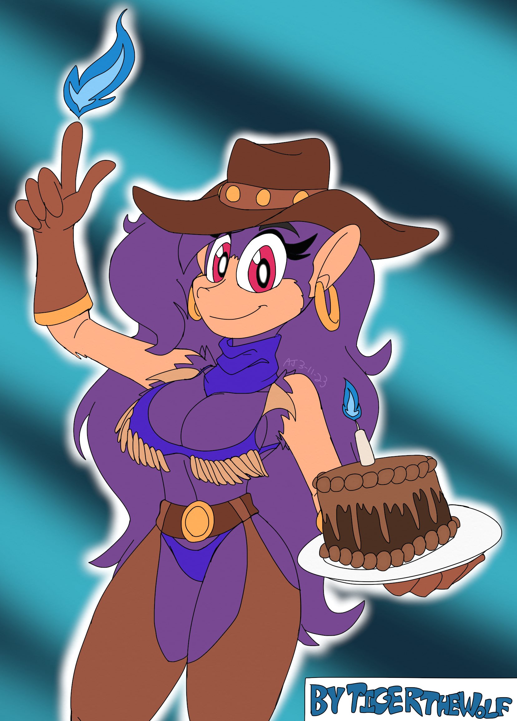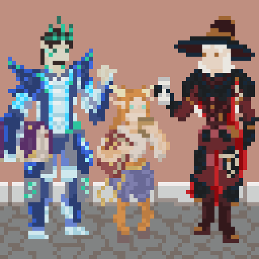 Our DnD party's bard Shirin, war cleric Katherina, and paladin D'ar, hanging out after a shopping session. While D'ar is explaining his new battle tactics to Kat, Shirin got herself a coffee and now she has the zoomies, the bane of D'ar's existence. And Kat is just enjoying the show. (reupload because I noticed that the animation wasn't playing properly)