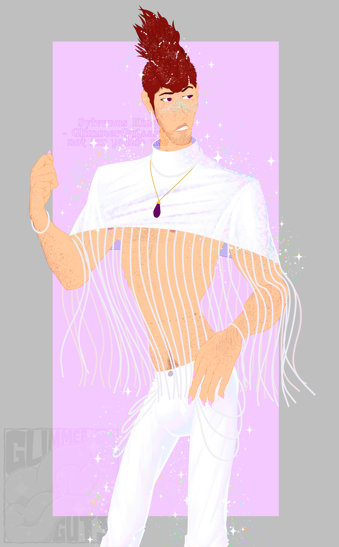 adderall shortage is ruining my life so I'm editing old art so I can pretend I have new art - straightened out the bottom edge of the top & added the visible back - fixed his waist - fixed his tits - cleaned up the sheen on the clothes - pearls switched to a photo material brush tip - changed the glitter on his face - messed around with some of the sparkle brushes I've since downloaded