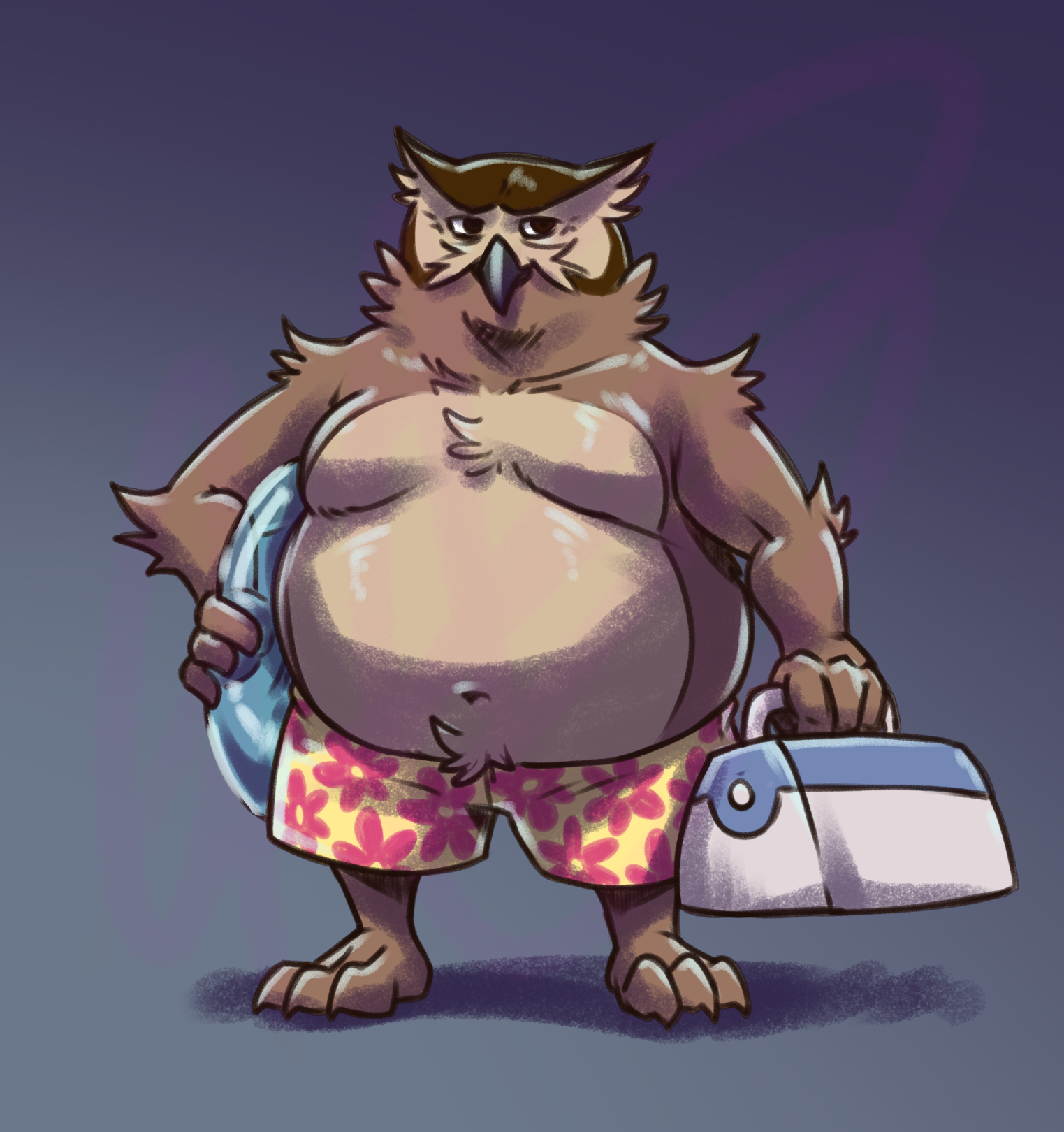 Even old man Miles has to get in on the swimwear sponsorships. Though he's more of a classic shorts guy. He strives for comfort, ya know! ALT TEXT: An anthropormophic horned owl in older middle age. He has a round shape with ruffled feathers along his neck, chest, shoulders, and elbows. He is wearing a pair of swim shorts with a flower motif on them, while holding an inflatable donut tucked beneath his right arm, and an ice chest in his left hand. He looks to the left as if he's wondering how he got roped into taking such a picture.
