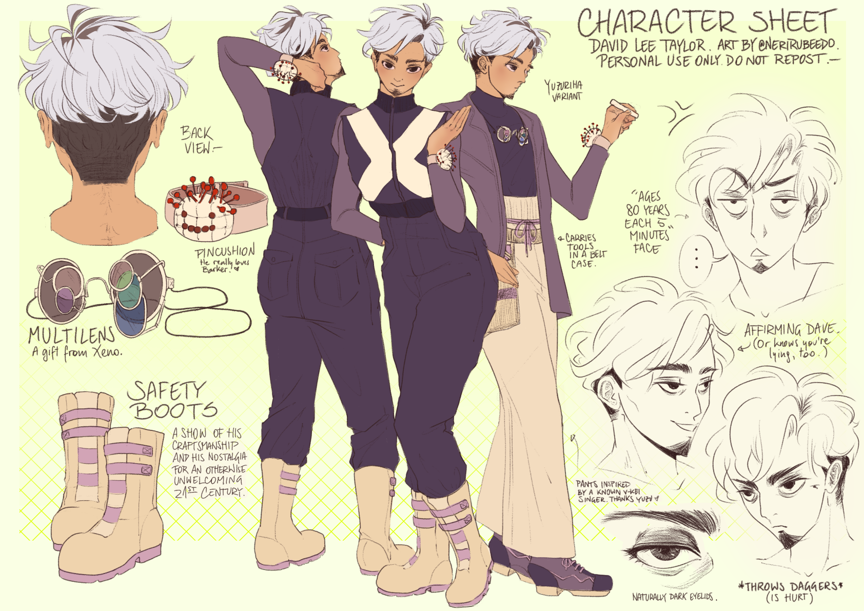 I'm probably doing one for america arc as well, he looks much different than in this more definitive design. I liked to explore his newfound security in his appearance and other aspects of his personality, even to the point of discovering he's been an extravert all the time; this is what ultimately inspires his attitude when making clothes for others, and he finally gets to enjoy it for himself. I love Dave so much!
