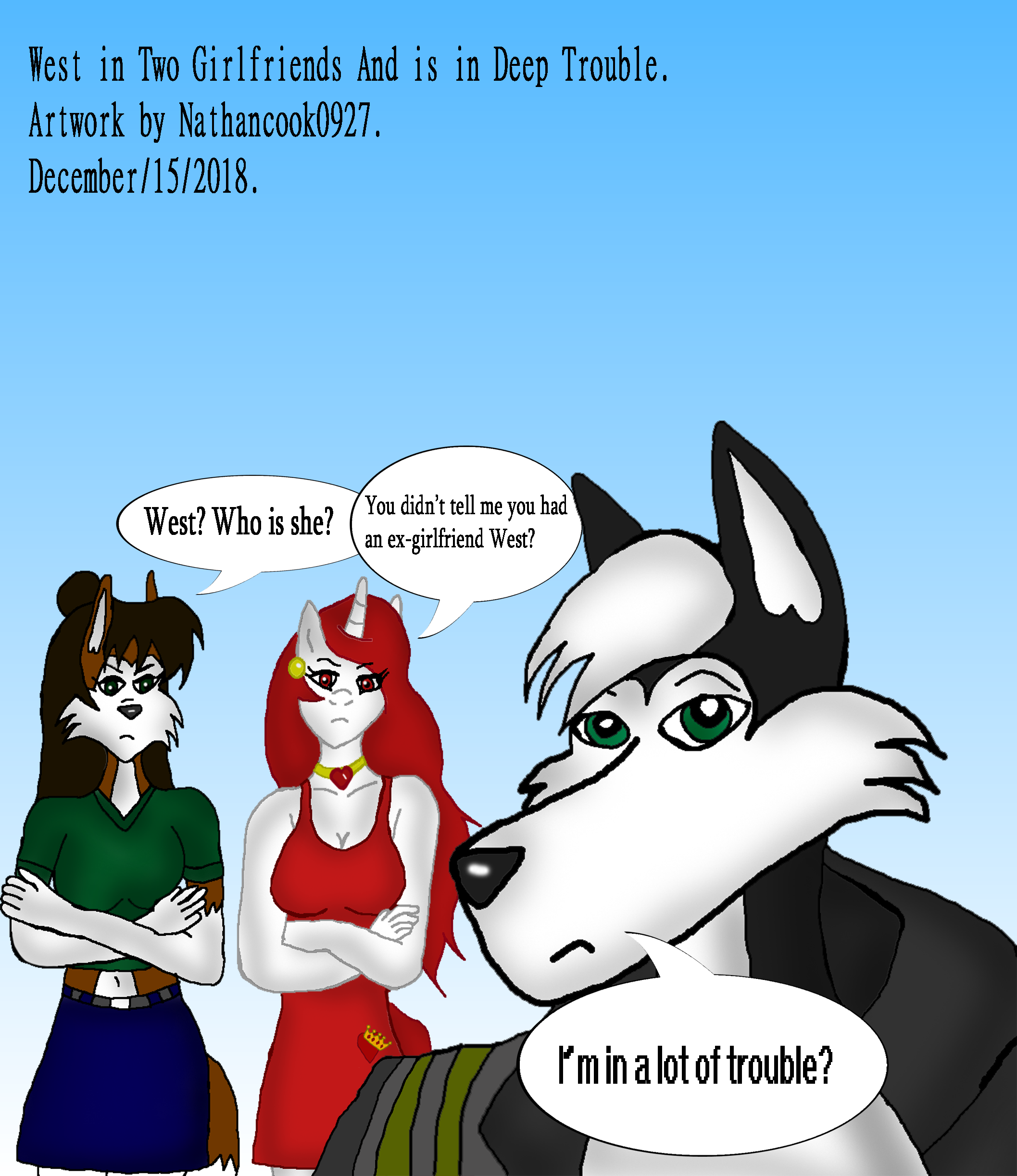 When I'd create West I would later create Téa to ship him with to avoid shipping him with anyone's OC and time after time of building up the 2 character around the 2010's I would break them up when West goes to prison for is vigilantism while she was raising their kids while being unmarried due to West trying to keep them from becoming a target from any of his enemies by keeping them out of his life until Téa decides to leave him permanently forcing him in a deep depression and joining the Military Volunteer program for prisoners hoping to die in combat until his Military crew were sent to Equestria where instead of dying West kind of learn to live again and ended up becoming MIA and would end up taking odd jobs until he was hired by the Red Mare as her hit man she would develop an interest in West even show her affections at him until some time later Téa would find him and question him.