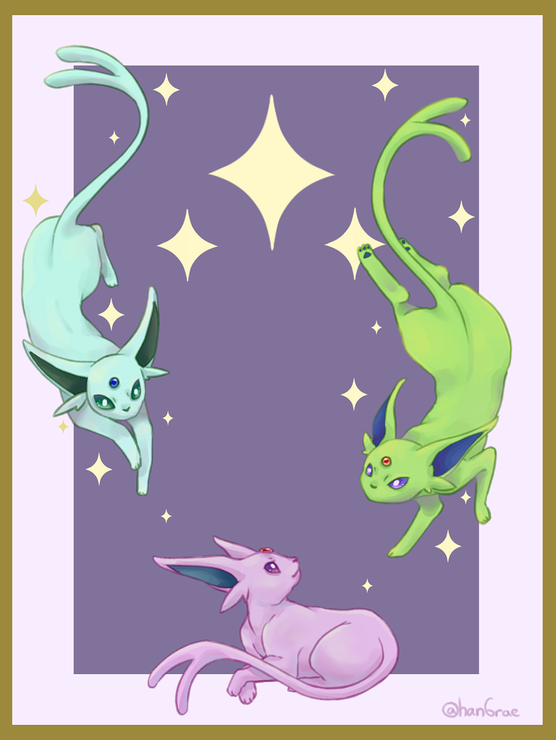 Normal espeon and 2 different shinies, one official and the other from Stadium 2. Call me annoying or whatever, but I do prefer the Stadium 2 colouring over that of the official shiny.