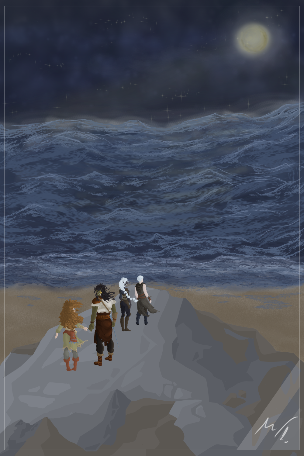 _Syn stopped dead in his tracks. He stared at the cliff that opened up in front of them and led abruptly into the depths. He didn't yet recognize the beach below, only heard the roaring and thundering of the waves as they hit the cliffs and, with the patience of time, carried away the stone, pebble by pebble. He smelled the salty air, but above all he saw the endless expanse of sky and sea before him. Both came closer together, merging into a line of the same color on the horizon, while the stars above cast small blobs of light on the waves below. So heaven and earth were bound together forever. No matter how far Synnover looked, that was all he saw. "We...have reached the edge of the world."_ Personal Work Created with Clip Studio Paint OCs: Syn "the white rabbit" Companions: Zarrah'lindae of the Nightblades, Raz'ulak "Razag" the Fearless, Crystin the healer Played RPG scene in the German roleplay forum "Celcia - eine Welt der Fantasy"