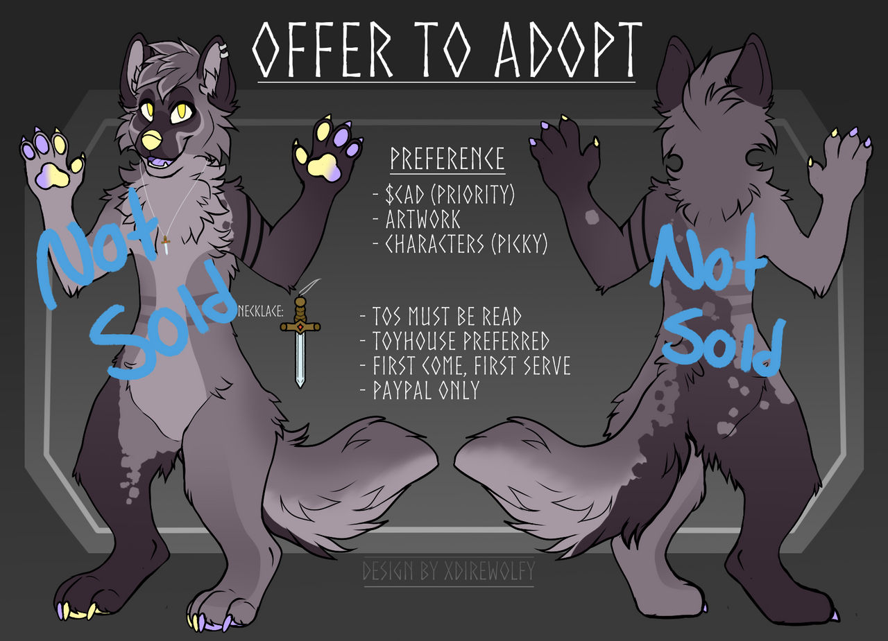 ### Before purchasing an adopt, please be sure to read through and agree with my Adoptable Terms of Service and Blacklist terms. By leaving an offer, you are automatically assumed to have read and agreed, and are bound to the ToS. **If you do not agree with my terms, do not make an offer.** ------ Terms of Service Links: [ **Blacklist**]( https://xdirewolfy.wixsite.com/termsofservice/blacklist) ###### [ Adoptable ToS](https://xdirewolfy.wixsite.com/termsofservice/adoptable-terms) ------ - Toyhou.se is highly recommended for transfer but not necessary - First come first serve - Comment or DM to offer - Artwork must be at least a halfbody with flat color ------ Owner: N/A ------ **Design**: xDirewolfy **Base by DookerTime** on DA