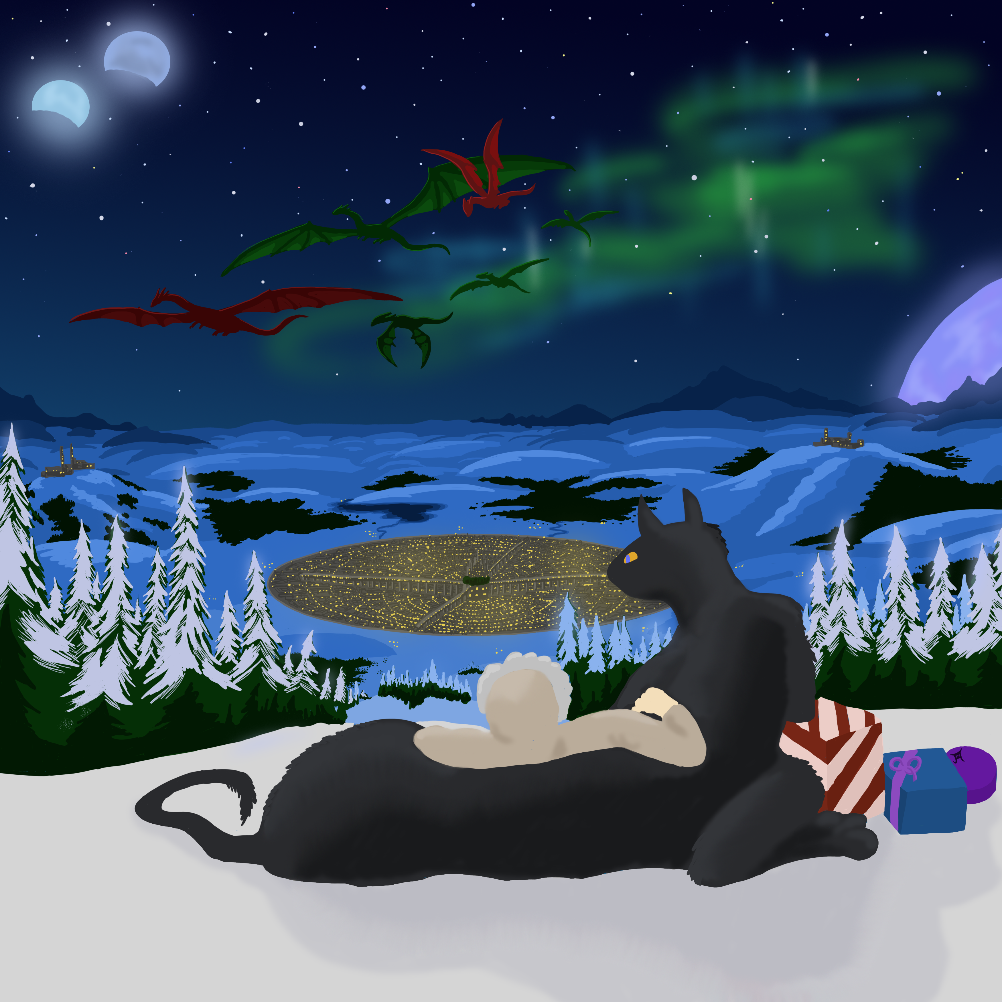 Completed in photoshop in about ~7 hrs, no plan-started last night.Where ever you are, whoever/whatever you are, and however your species celebrates the height of this cold season, may it be surrounded by friends and loved ones, filled with food, and as comfortable as you can be :) Seasons greetings from the Song of the Devilstorm webcomic (still WIP) characters overlooking the city of Alabandrin. MC cuddling against the flank of his love, P'traltis, dragon family flying overhead: (short names) Arnkit and her mate Verthrik, and their children Smara, Vred'tiss, Herinn, and Kyrvat. Completed in photoshop in about ~7 hrs, no plan-started last night.0 Comments 0 Shares 0 Views -