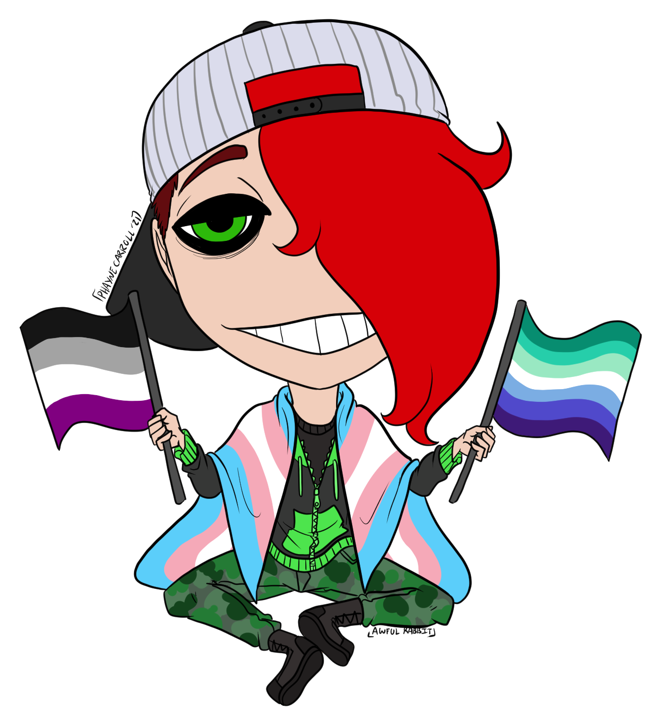 • My final, personal pride chibi. This last one is, well, of me! For those who don't know, I am trans, though I don't talk about it a ton. I've done a lot to try to pass on the internet for fear of being treated "like a girl", and, well... It's mostly worked! Still, I wanted to try to be more open about myself, and so here is what I've got.
