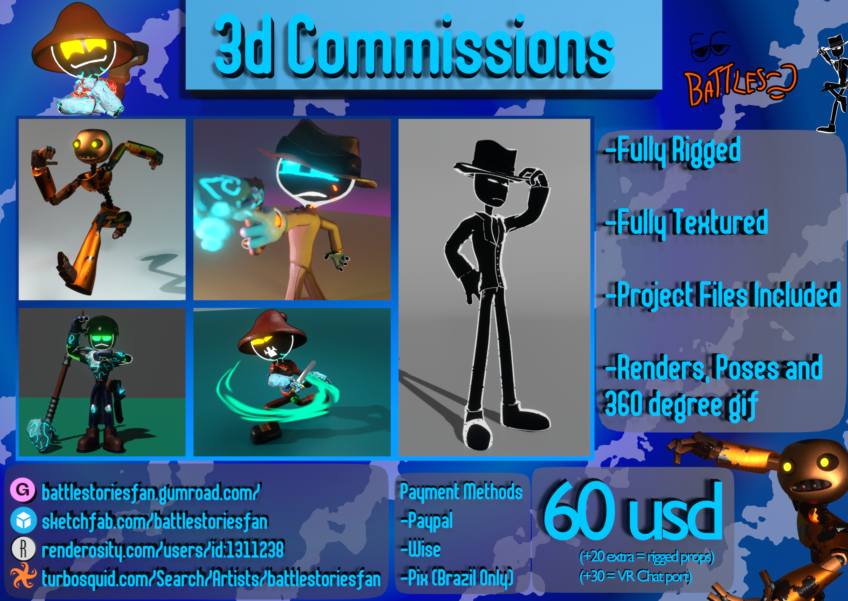 3D Commission Sheet ORIGINALLY UPLOADED JANUARY 06/2023 And continuing with my second commission sheet. You can find and inspect my renders and 3D models on the sites I listed on the comm sheet! Again, let's not waste any time and get right to it. (Again I hope there are no secret commission area that i'll have to configure later...) -"HOW WILL THE COMMISSION HAPPEN?" ->Commission is discussed PRIVATELY, either through the site the sheets are posted or through the listed contact options. I DON'T GIVE MY CONTACTS PUBLICALLY. NOTE ME AND I'LL PROVIDE THE CONTACTS. ->We'll discuss themes, character descriptions (or references), If you want the model for 3D Printing, for a game/animation or just to pose for reference. After we reach an agreement, a price will be given to you. Once it's all modelled and finished, pay me please. ->Progress renders will be sent to you as I work on your commission. ->After your commission is finished, you'll receive a .rar file containing: The .blend project file, the textures, an .fbx port and a .dae port -"NOTES AND OTHER DETAILS' ->Please try to be as descriptive as you can be with what you want. Not only because it helps me know exactly what you wish and avoids the migraines of having to revise commissions, but also because it's really irritating to deal with someone that speaks in 2-3 words. It's SPECIALLY irritating to revise 3D models because they take a lot more time and effort to fix than drawings. ->DO NOT PESTER ME FOR UPDATES. I'll already send you Progress renders, and my finished 3d models take around a week, sometimes 10 days to finish depending on complexity. I will give you 2 warnings over repeated messaging. On strike 3, your commission is canceled on the spot. ->Don't try to scam me. If you don't have the agreed amount by the end of your comm, I can try to be negotiable depending on the reason as to why. But if you try to screw me over, your comm will be canceled and you blocked and added to my blacklist. ->I reserve the right to REFUSE a commission based on what you want me to model and how. ->I don't do photo/hyper realistic models. Not everyone has a NASA computer to render and simulate HAIR. ->As mentioned above, my models are stylized and toony in shading. Not being able to simulate thousands of individual hair and fur strands doesn't mean I don't do anthro characters. Because I do model them. ->You're free to use the model you're given in anything you want, even commercial projects if you're wanting to sell a game. Follow my other stuff right here! https://linktr.ee/battlestoriesfan0 Comments 0 Shares 0 Views -