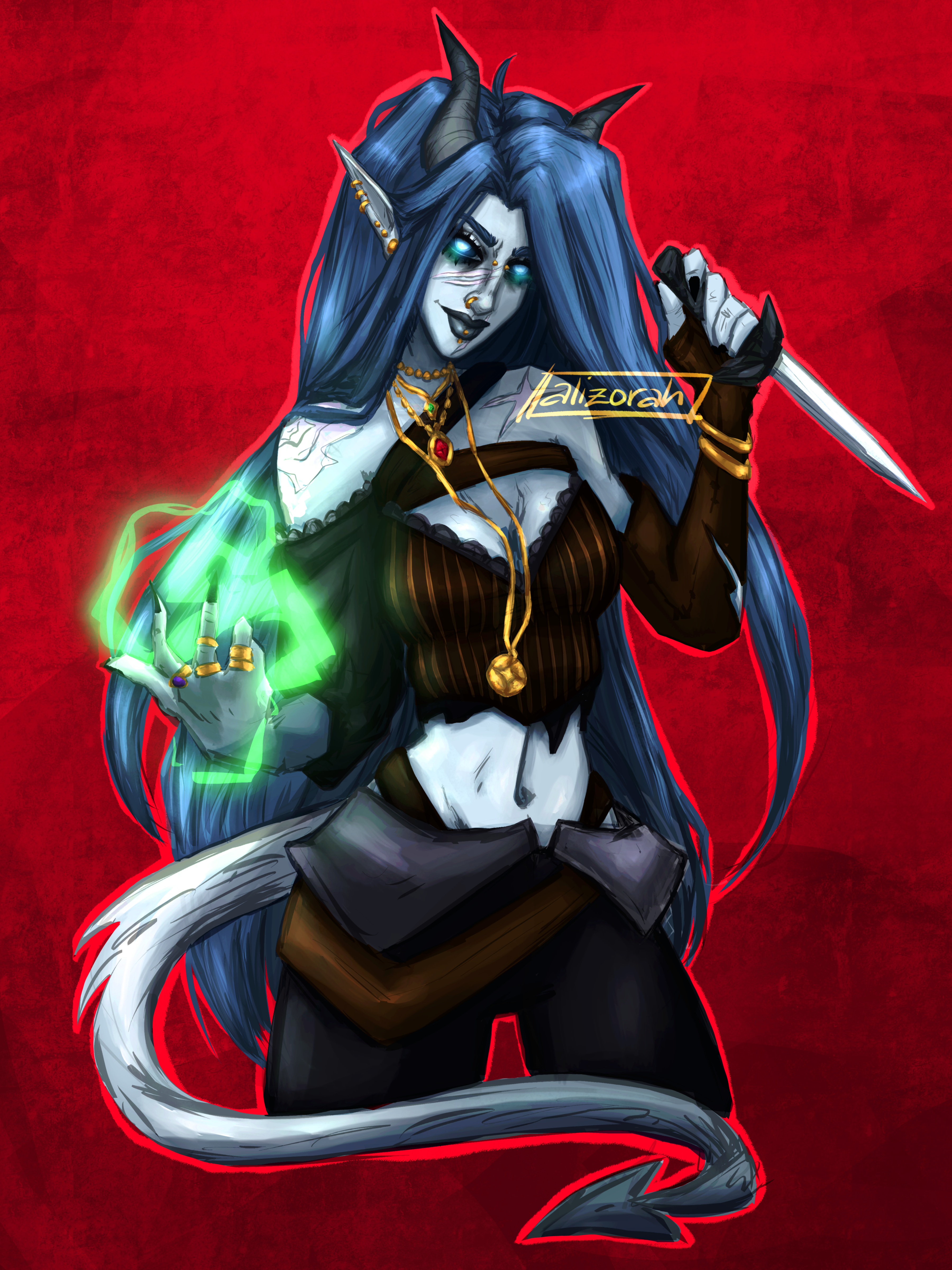 • My character for one of our campaign story oneshots - tiefling rogue/warlock. Do not use or repost.